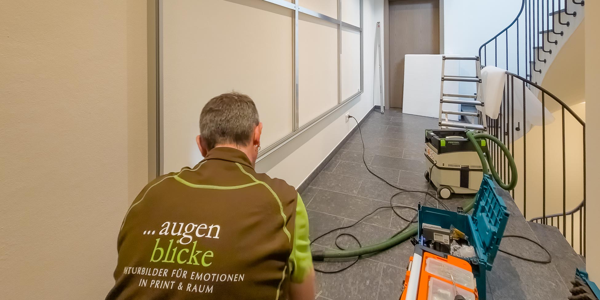 Verbesserung von Akustik und Raumwirkung Neben dem Treppenhaus wurde auch in einem großzügigen Büro ein Akustikbild installiert, um eine ruhige und konzentrierte Arbeitsumgebung zu schaffen. Ein besonderer Vorteil unserer Systeme: Die Bildmotive können jederzeit einfach gewechselt werden – es genügt, nur den Bildbanner auszutauschen. So bleibt das Raumkonzept flexibel und individuell anpassbar.