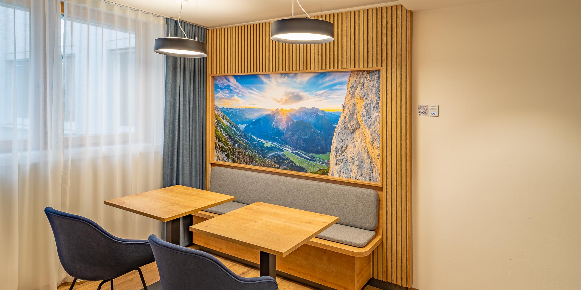 Einige Räume wurden mit vollflächigen Fototapeten gestaltet. Dadurch entsteht eine immersive Raumwirkung, die den Betrachter direkt in die Landschaft eintauchen lässt.