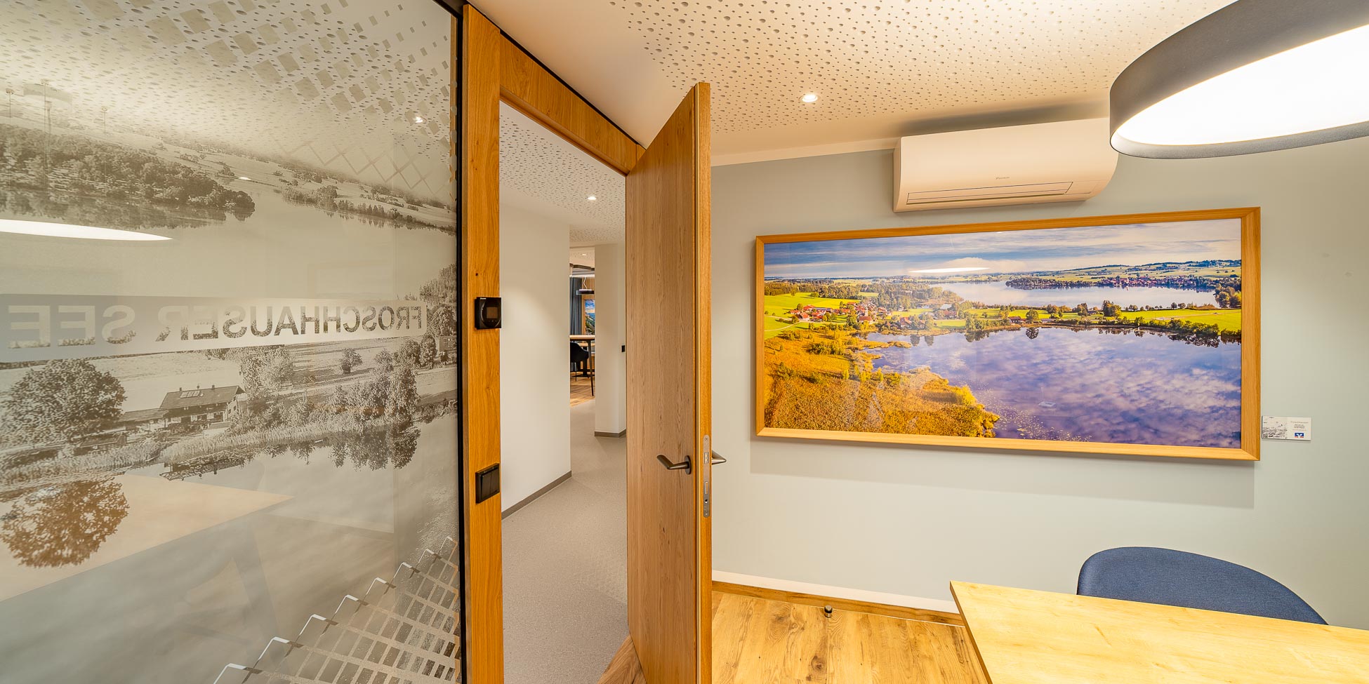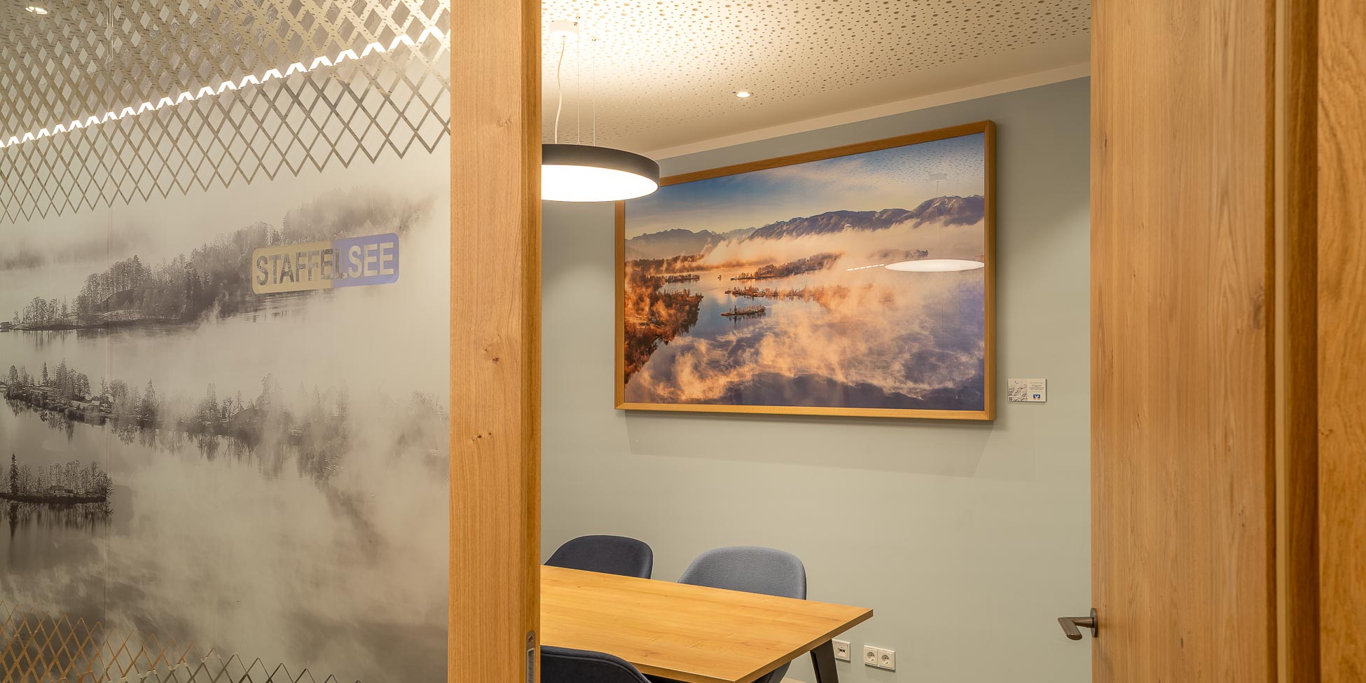 In ausgewählten Bereichen wurden Bilder in Akustikpaneele integriert. Dies verbessert die Raumakustik deutlich und schafft eine angenehme Gesprächsatmosphäre.