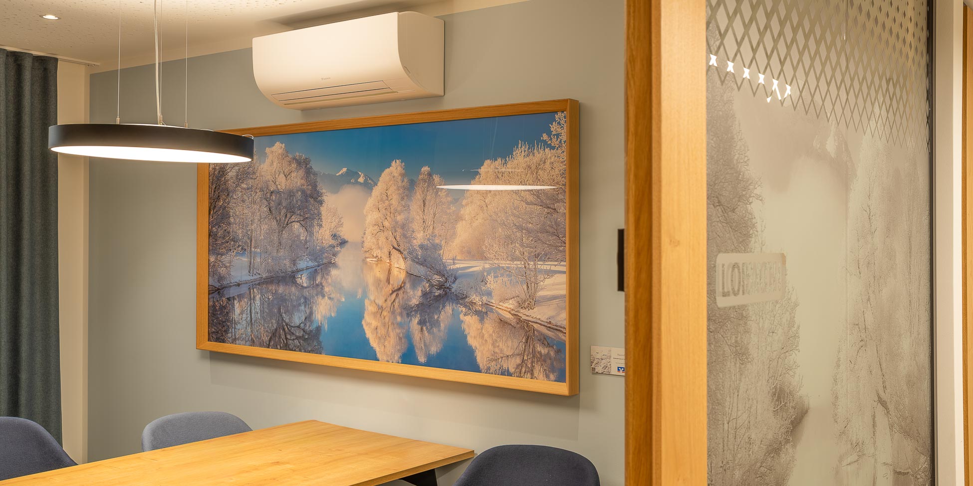 Ein Teil der Motive wurde hochwertig hinter Glas gerahmt und mit Holzrahmen versehen – eine zeitlose und ruhige Lösung für Beratungsbereiche.