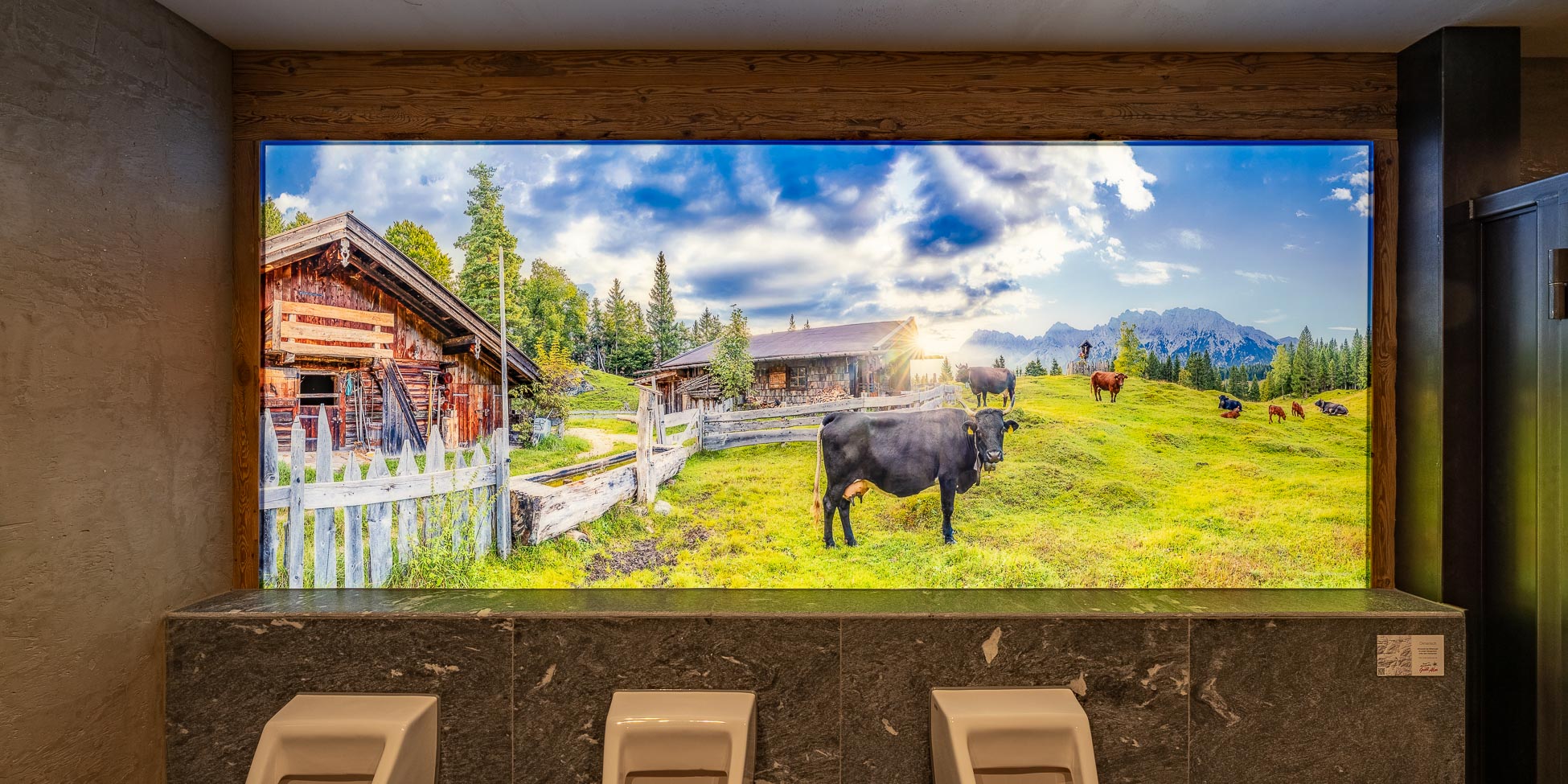 Für den traditionsreichen Alpengasthof Gröbl-Alm in Mittenwald (www.groeblalm.de) durften wir zwei großformatige LED-Leuchtbilder liefern und montieren. Im Zuge des Neubaus der Damen- und Herren-Toiletten im Untergeschoss entstand ein hochwertiges Gestaltungskonzept, das Funktion, Atmosphäre und regionale Identität vereint.