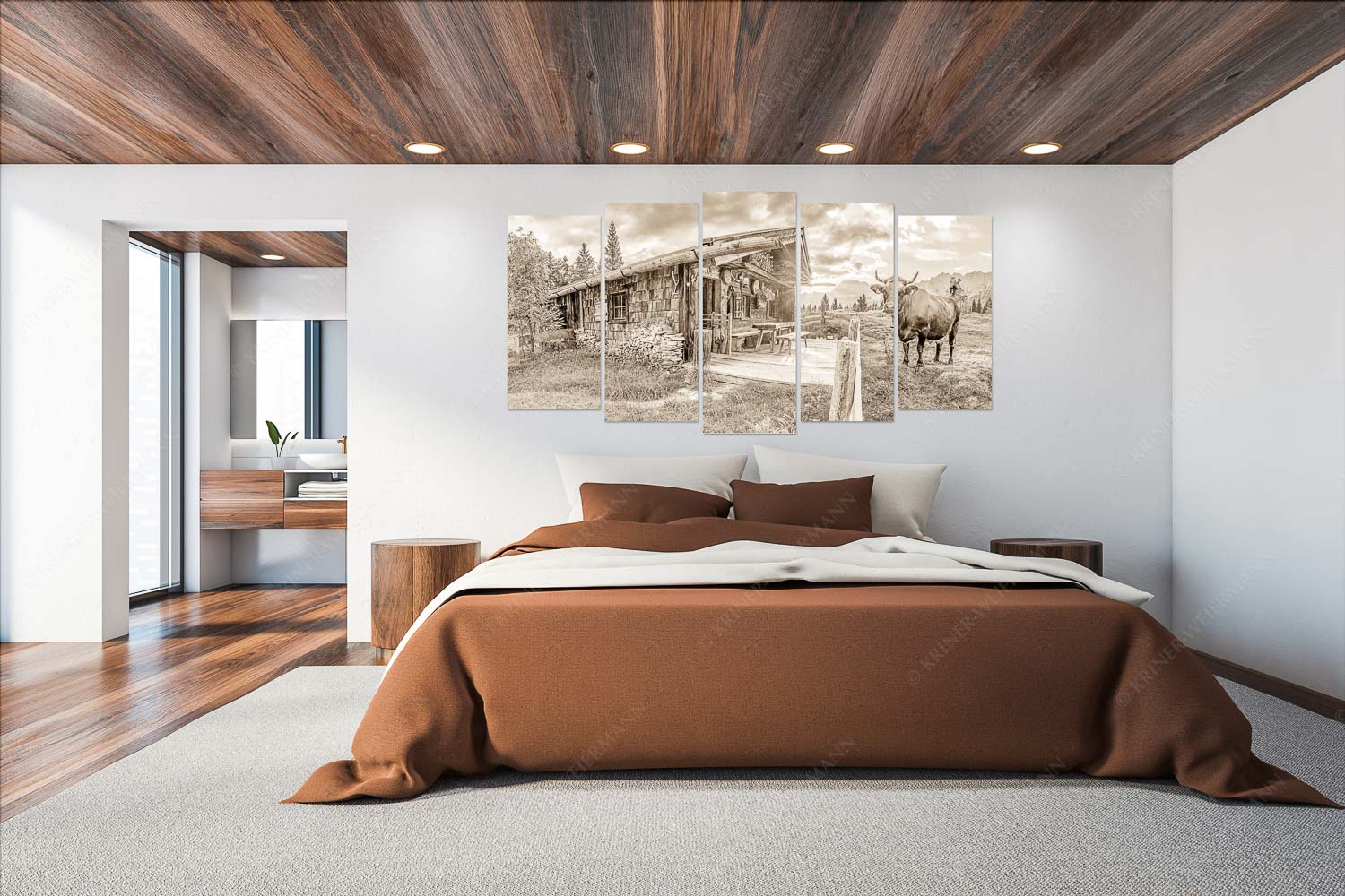 Auf einer Alm oberhalb von Mittenwald öffnet sich in den frühen Morgenstunden eine Szenerie, die zugleich bodenständig und beeindruckend ist. Die ersten Sonnenstrahlen brechen als feiner Stern durch die Wolken und legen einen warmen Glanz über Weide, Stall und die malerische Almhütte mit ihren verwitterten Schindeln. Vor der Hütte zieht sich ein schlichter Holzzaun, dahinter grasen ruhige Rinder und drei junge Kälber auf den Buckelwiesen – alle mit Hörnern, ein Bild echter, traditioneller Almwirtschaft. Links im Vordergrund steht der hölzerne Brunnen, aus dem das klare Wasser für die Tiere läuft. Weiter hinten erhebt sich ein schlichtes Feldkreuz, eingerahmt vom mächtigen Karwendel mit Wörner, Tiefkarspitze und Westlicher Karwendelspitze. Die Mischung aus friedlicher Morgenruhe, authentischem Almleben und der kraftvollen Bergkulisse macht dieses Motiv zu einem eindrucksvollen Moment echter bayerischer Landschaftskultur.
