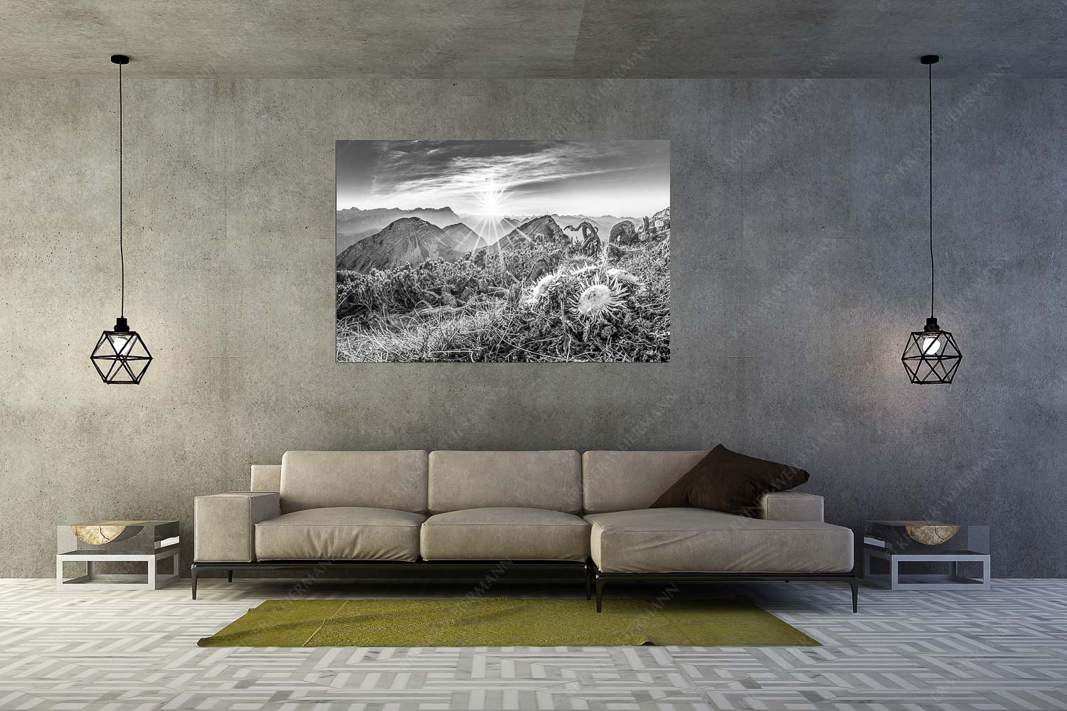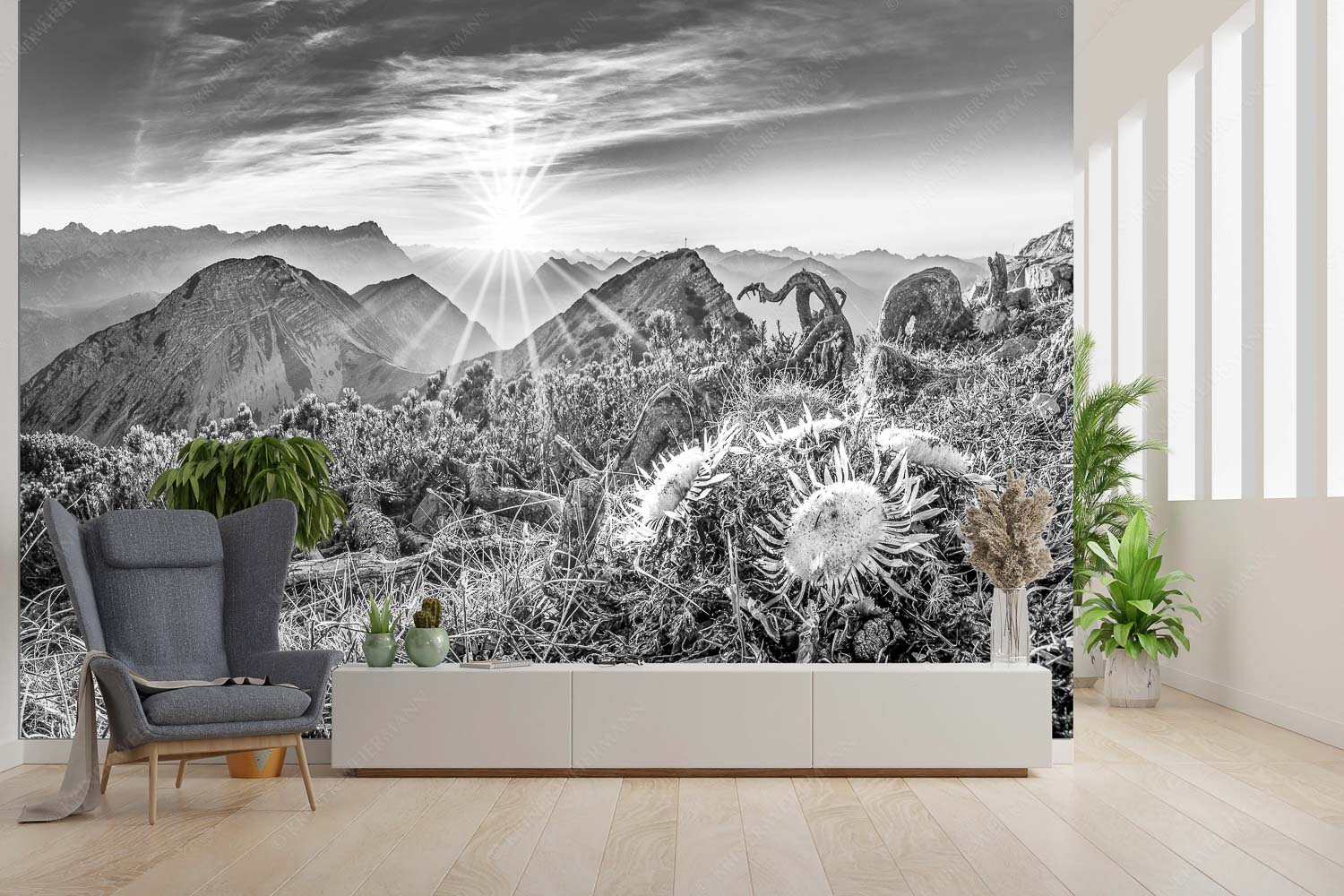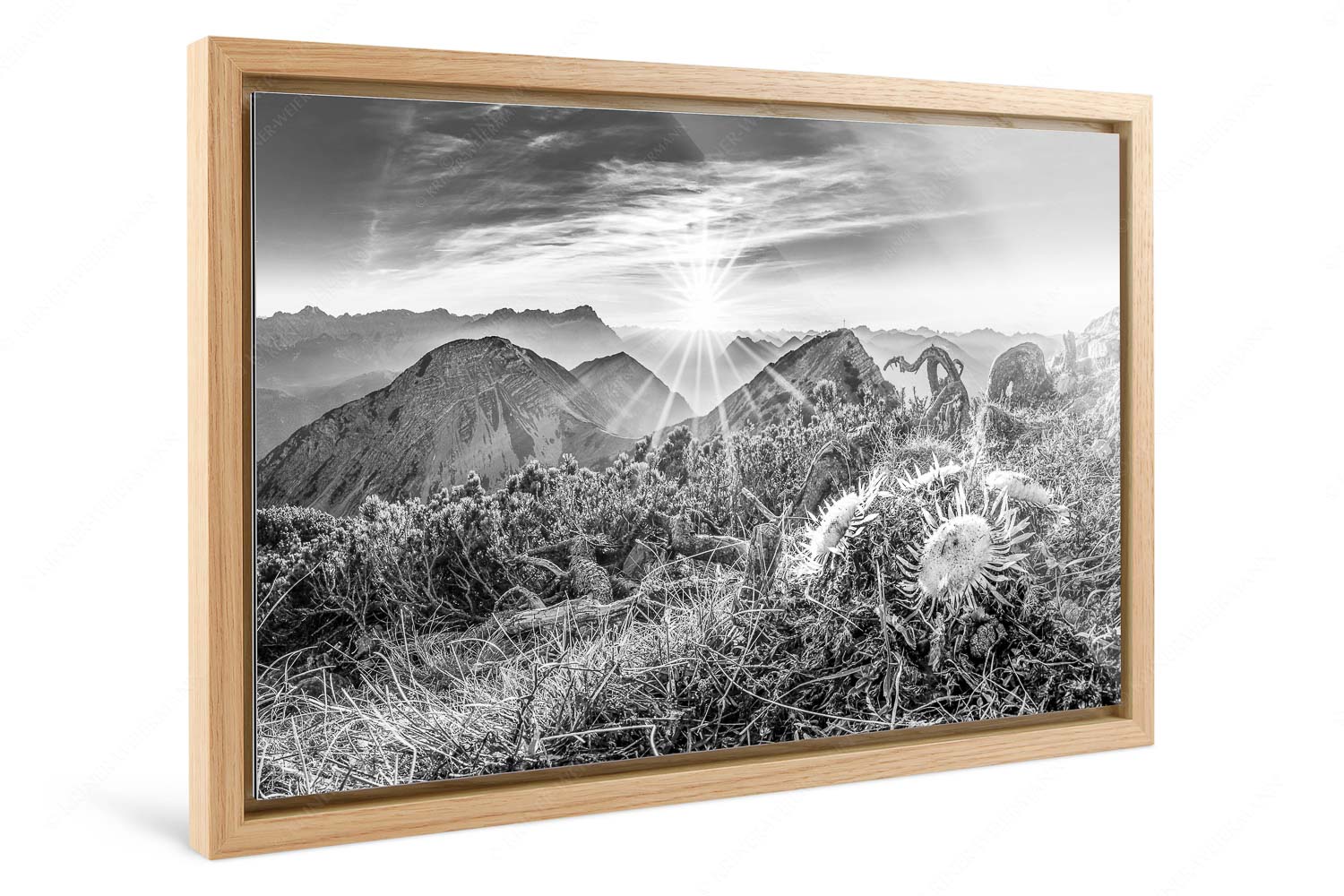 Das Bild „Distelquartett“ vereint die karge Schönheit des Spätherbstes mit einem faszinierenden Sonnenuntergang über den Alpen. Im Vordergrund stehen vier Silberdisteln, die trotz des frostigen Novembers in voller Pracht erstrahlen. Ihre silbrig-weißen Blätter und die filigranen Strukturen erinnern fast an eine Blüte und verleihen dem Bild eine besondere Tiefe. Der Blick schweift vom Rißkopf in die Ferne, wo die Sonne langsam neben der majestätischen Zugspitze untergeht. Die warme Farbpalette des Sonnenuntergangs – in Gold, Orange und Rosa – steht im Kontrast zur Kühle des Novemberabends und taucht die Szenerie in ein magisches Licht. Die Kombination aus der filigranen Schönheit der Disteln und der überwältigenden Kulisse des Gebirgspanoramas schafft eine harmonische und dennoch dynamische Atmosphäre. „Distelquartett“ erzählt von der Ruhe und Erhabenheit der Natur im späten Herbst, eingefangen in einem einzigartigen Moment.