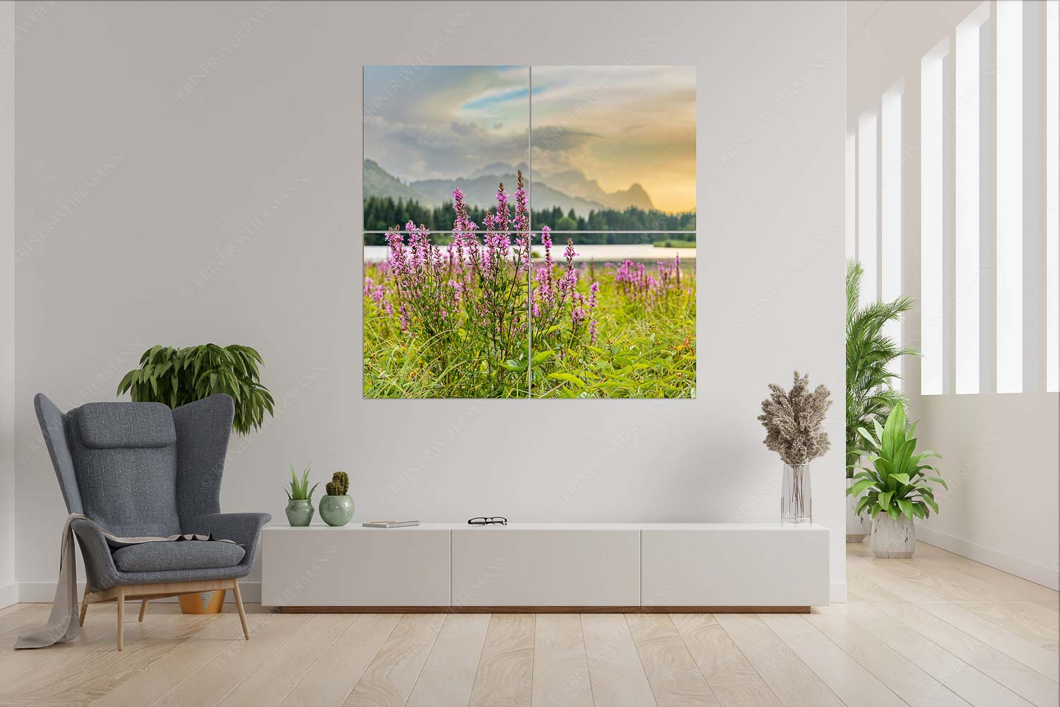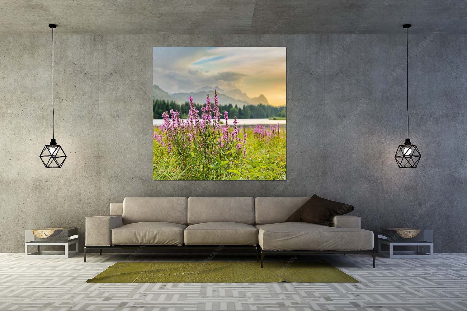 Das Bild „Gewöhnlicher Blutweiderich“ fängt einen besonderen Moment nach einem sommerlichen Gewitterregen am Geroldsee ein. Im Vordergrund blüht ein üppiger Busch des namensgebenden Blutweiderichs – seine aufrechten Blütenkerzen leuchten regelrecht vor dem frischen, noch feuchten Grün der Umgebung. Die Luft ist klar, die Farben intensiv. Dahinter liegt ruhig der Geroldsee, von dem sich die ersten Nebelschwaden bereits zurückziehen. Über dem See öffnet sich der Blick auf das imposante Zugspitzmassiv – mit Alpspitze, Zugspitze und dem Waxenstein, deren Silhouetten sich deutlich vom dramatisch bewölkten Himmel abheben. Doch zwischen den Wolken zeigen sich erste Lichtstrahlen: Ein faszinierendes Schauspiel aus Licht, Schatten und sich klärender Stimmung. Dieses Bild verbindet florale Schönheit mit alpiner Weite und bringt die besondere Ruhe nach dem Regen auf eindrucksvolle Weise zur Geltung – ein kraftvoller, stiller Moment in der Natur.