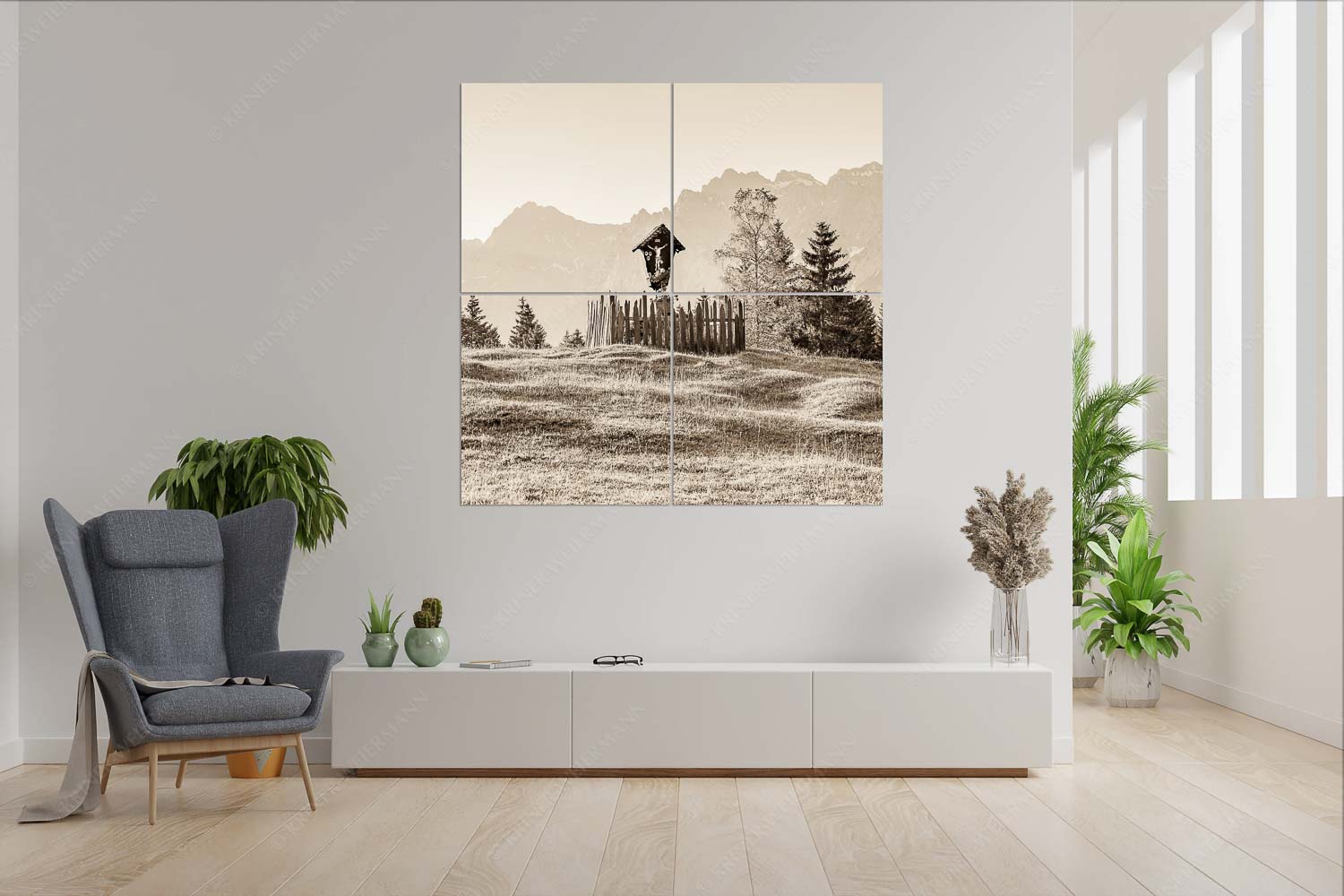 Göttlich 1:1 sepia — Feldkreuz in den Buckelwiesen mit Karwendel
