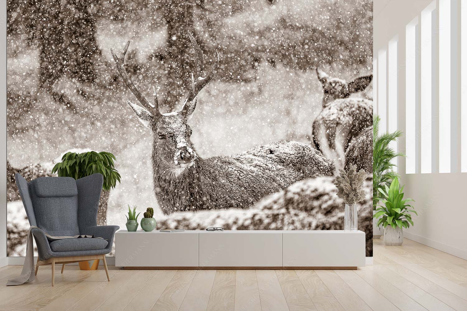 Rothirsch im Schneegestöber in einer Wildfütterung bei Garmisch-Partenkirchen