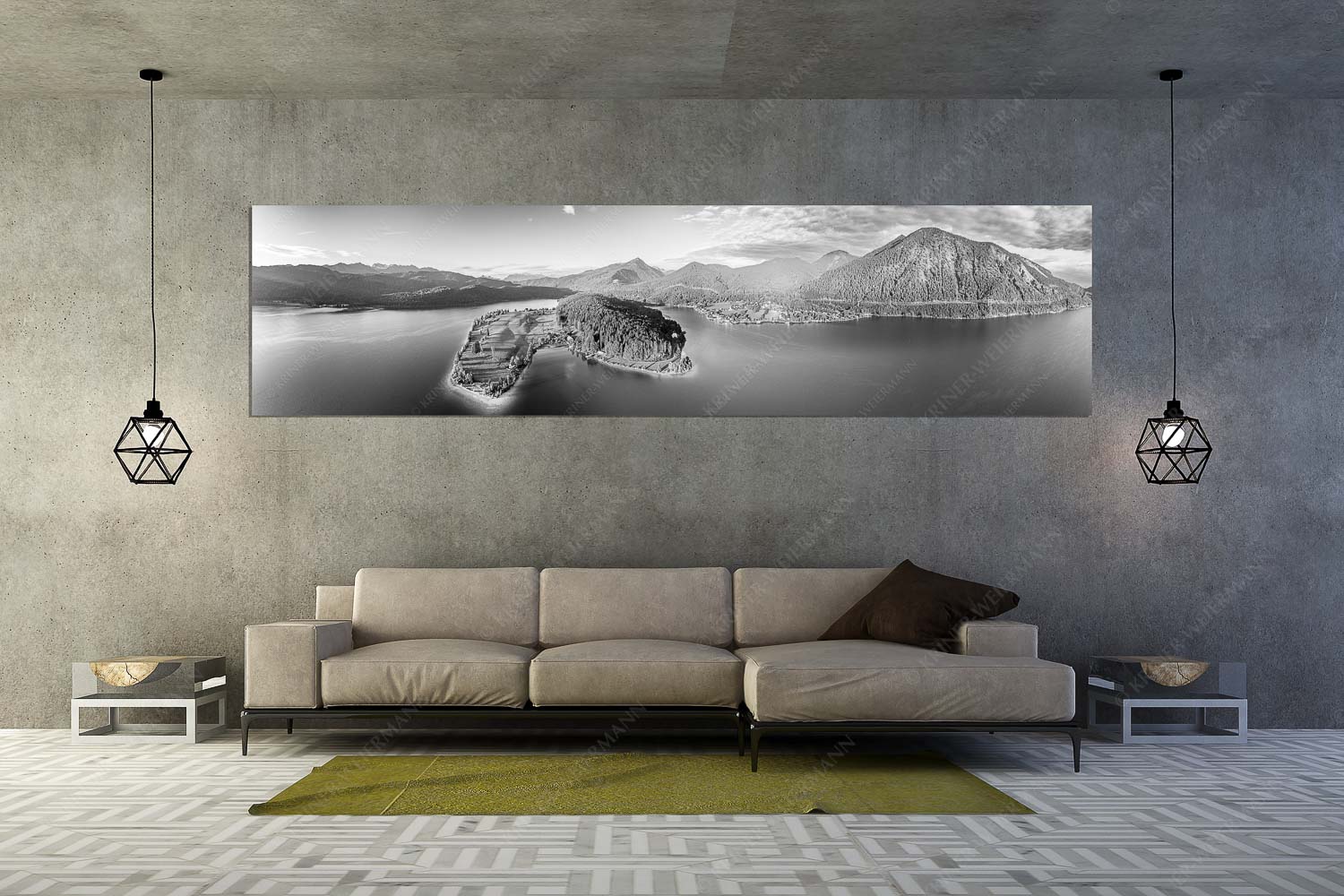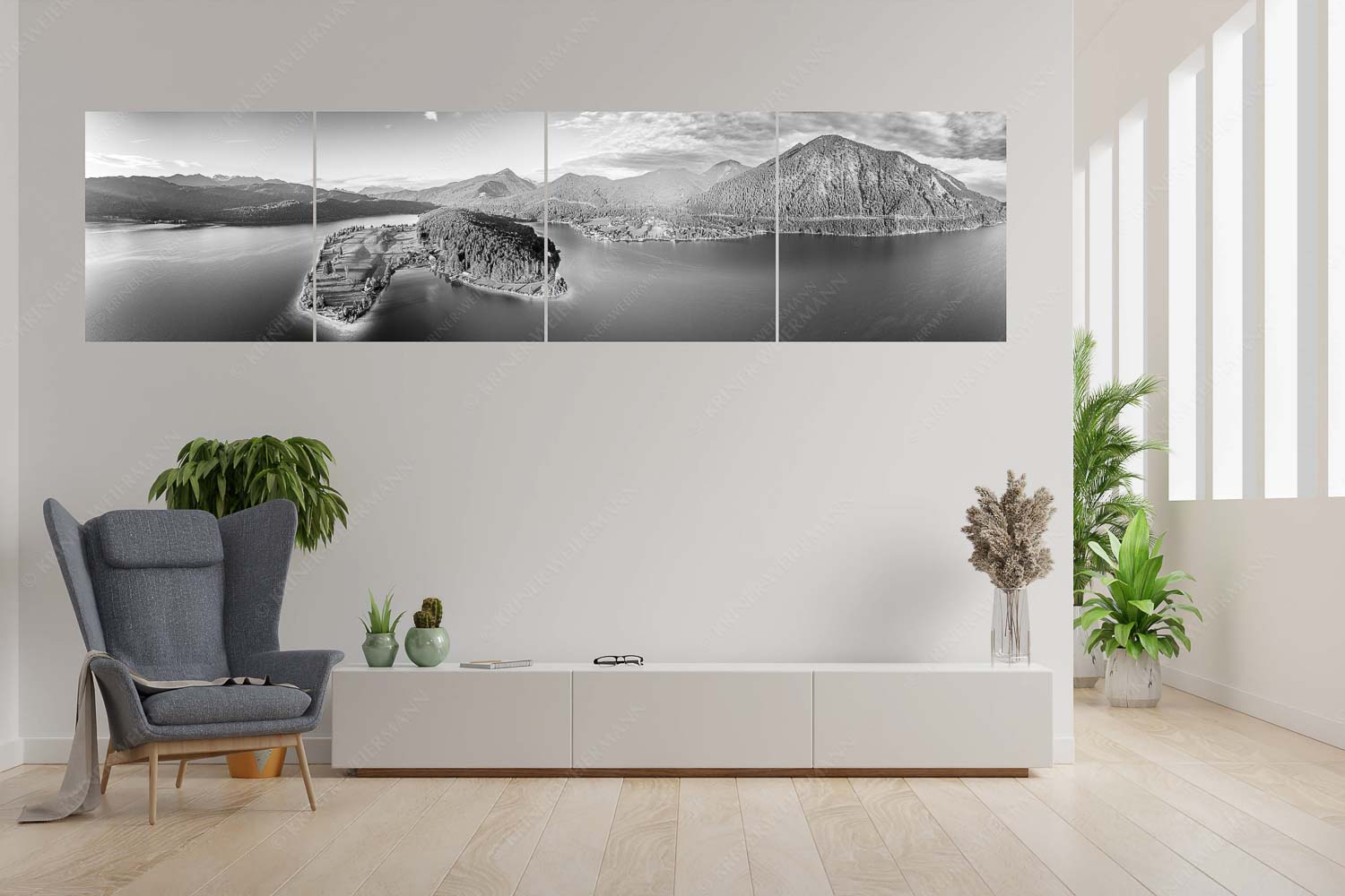 Das Bild „Himmelswiesn“ zeigt eine eindrucksvolle Luftaufnahme des Walchensees in den frühen Morgenstunden – ein stiller Moment, in dem das Licht sanft die Landschaft berührt. Der Blick führt über die Halbinsel Zwergern mit der malerischen Kirche St. Margareth, die eingebettet in die grüne Wiese auf ihre eigene, stille Weise über den See wacht. Dahinter liegt die sogenannte Himmelswiese – eine leicht erhöhte, offene Fläche mit einzelnen Bäumen, deren lange Schatten über das Gras ziehen und den Tagesanbruch spürbar machen. Rechts davon erkennt man den kleinen Ort Walchensee, ruhig gelegen am Seeufer. Im Hintergrund baut sich ein majestätisches Bergpanorama auf: der Simetsberg, das Estergebirge und die Nordflanken des Wettersteingebirges mit ihren schroffen Formen. Die Farben sind weich, das Licht klar – ein fast poetischer Moment voller Harmonie zwischen Wasser, Land und Himmel.