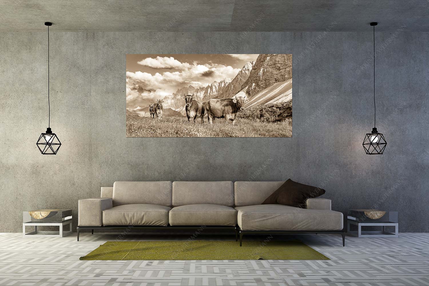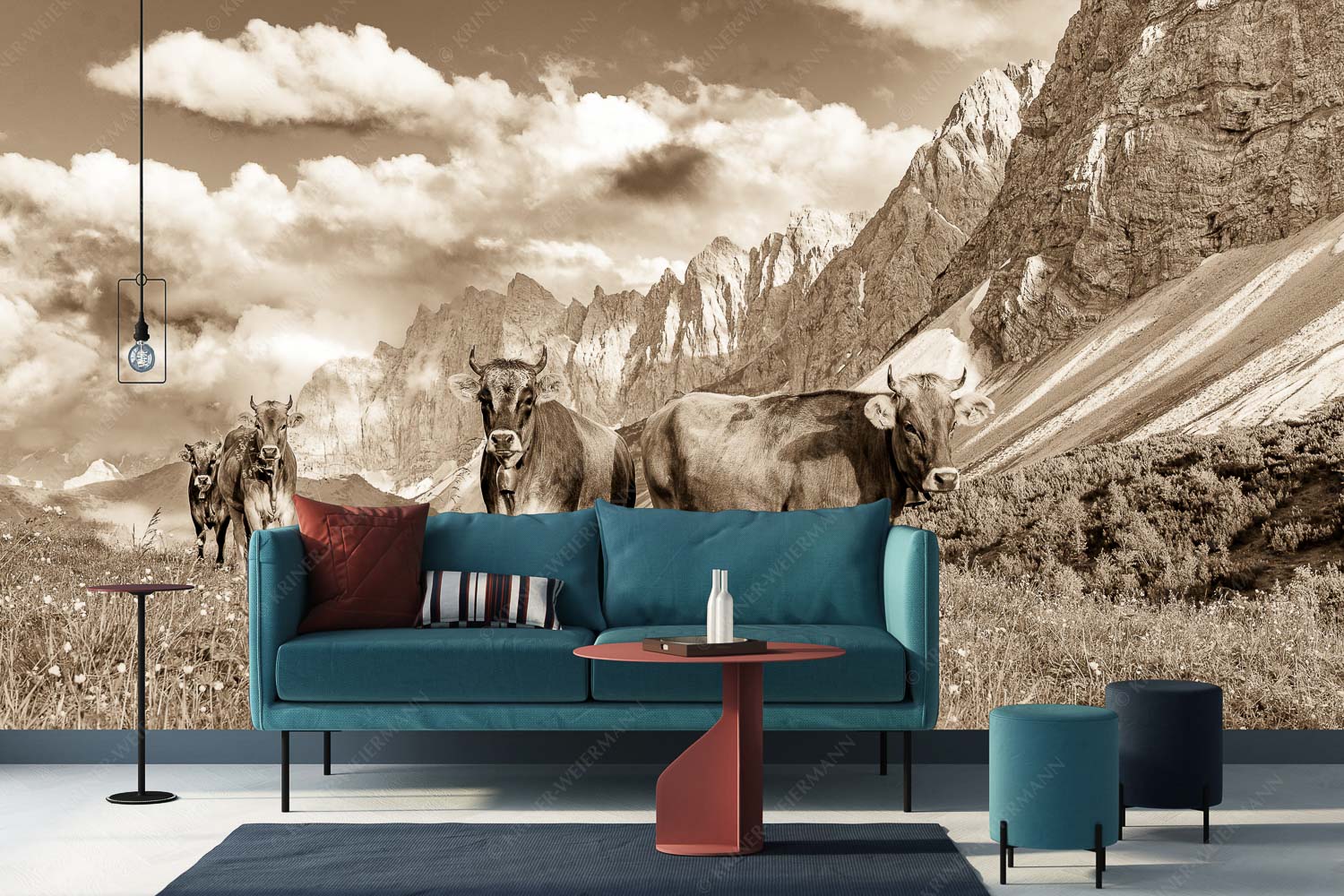 Hochalm II 2:1 sepia — Junge Kühe mit Laliderer im Karwendel