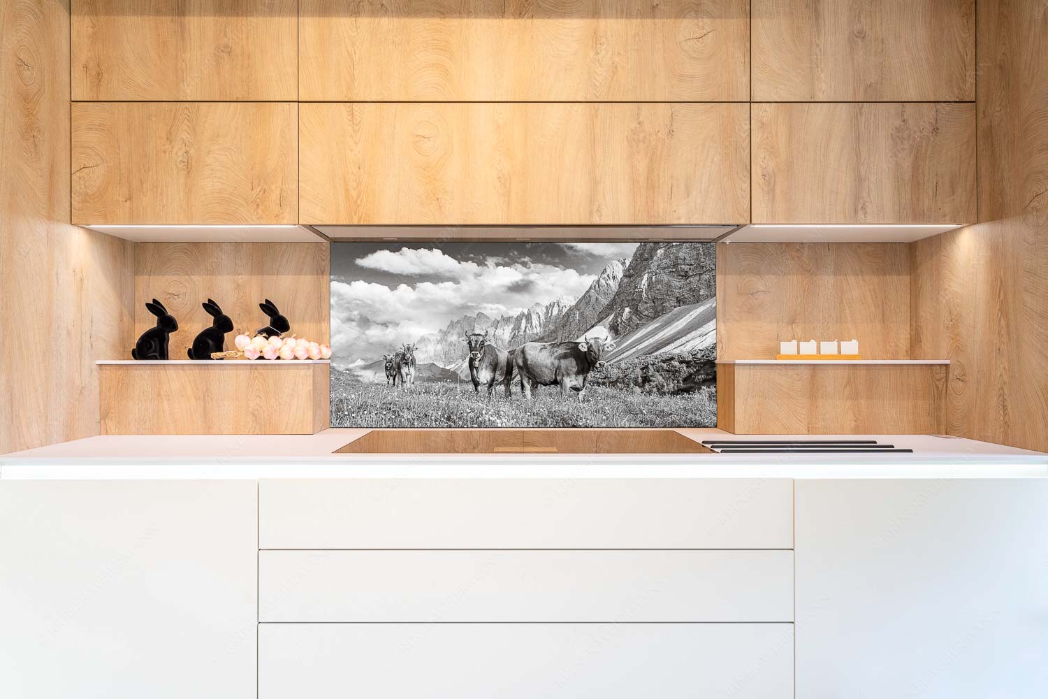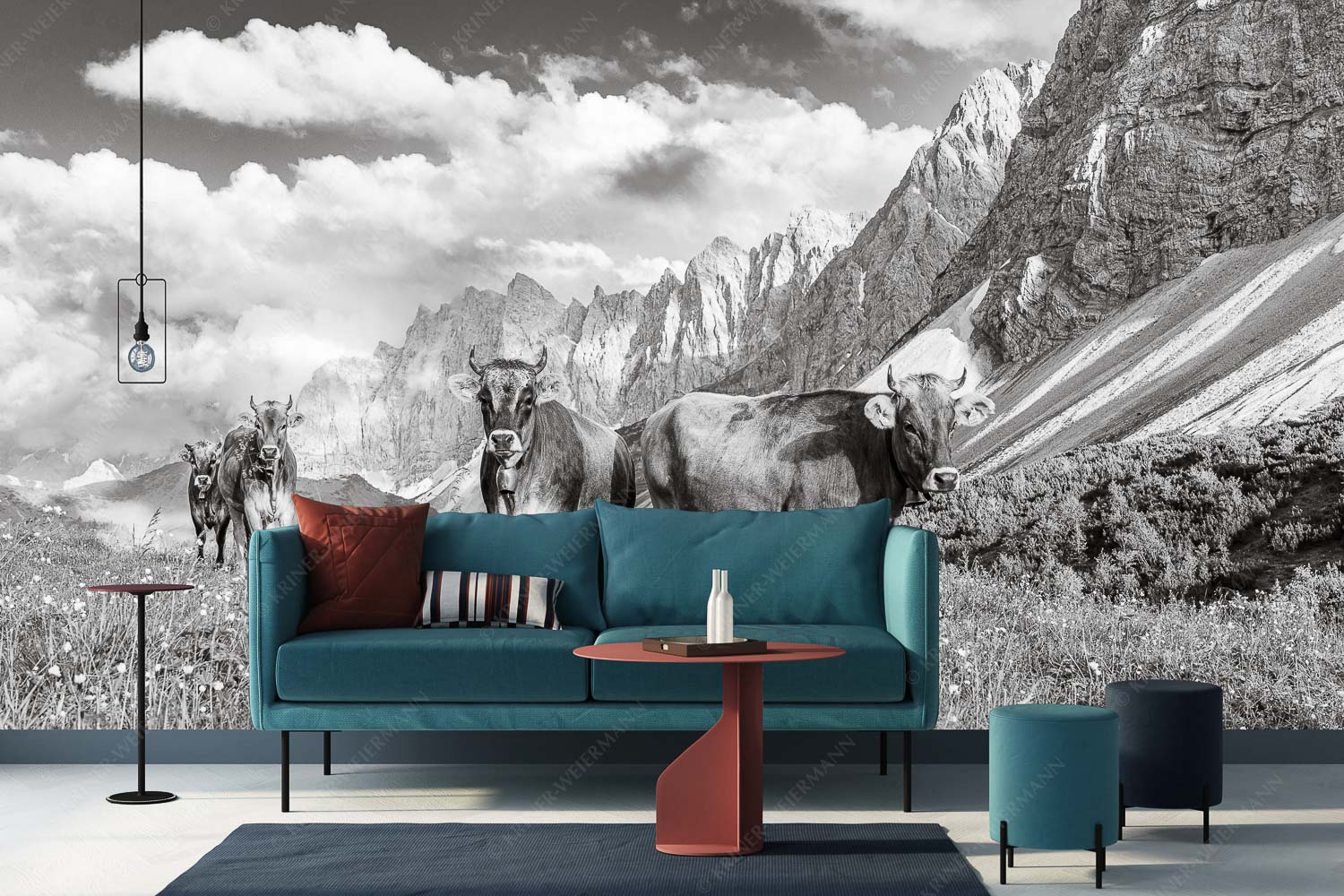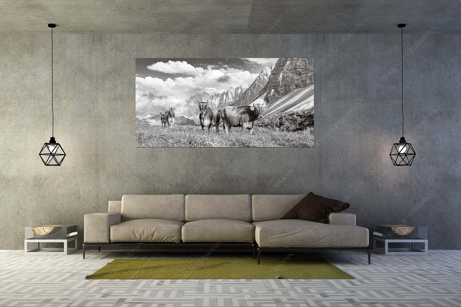 Hochalm II 2:1 sw — Junge Kühe mit Laliderer im Karwendel
