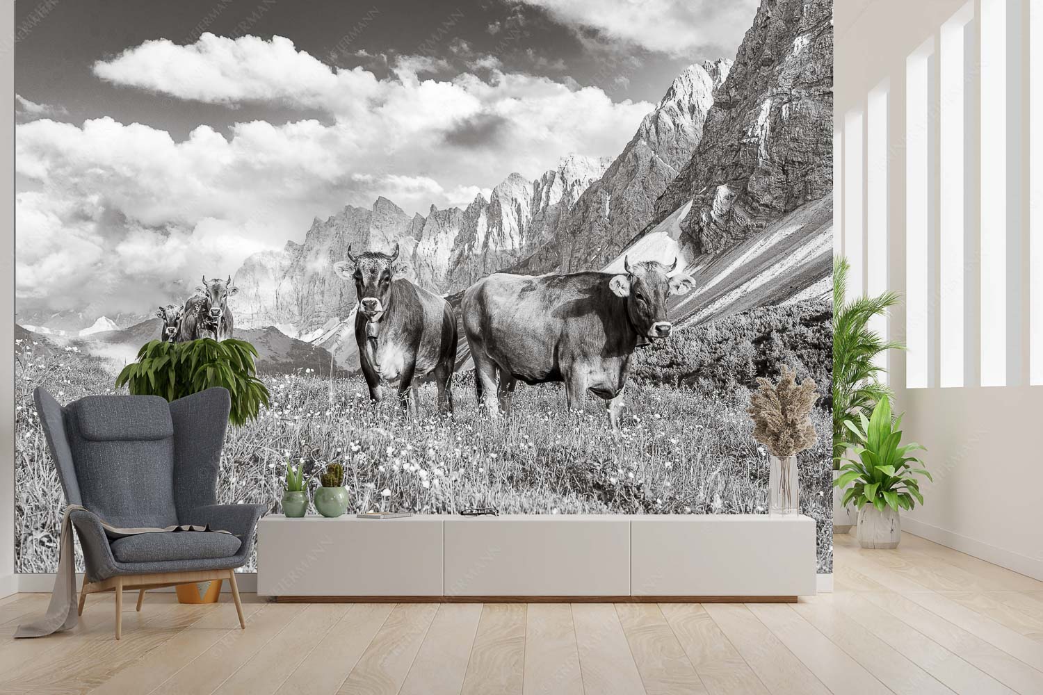 Hochalm II 3:2 sw — Junge Kühe mit Laliderer im Karwendel