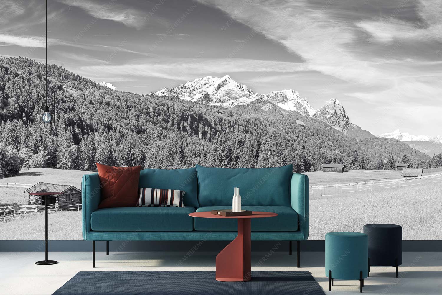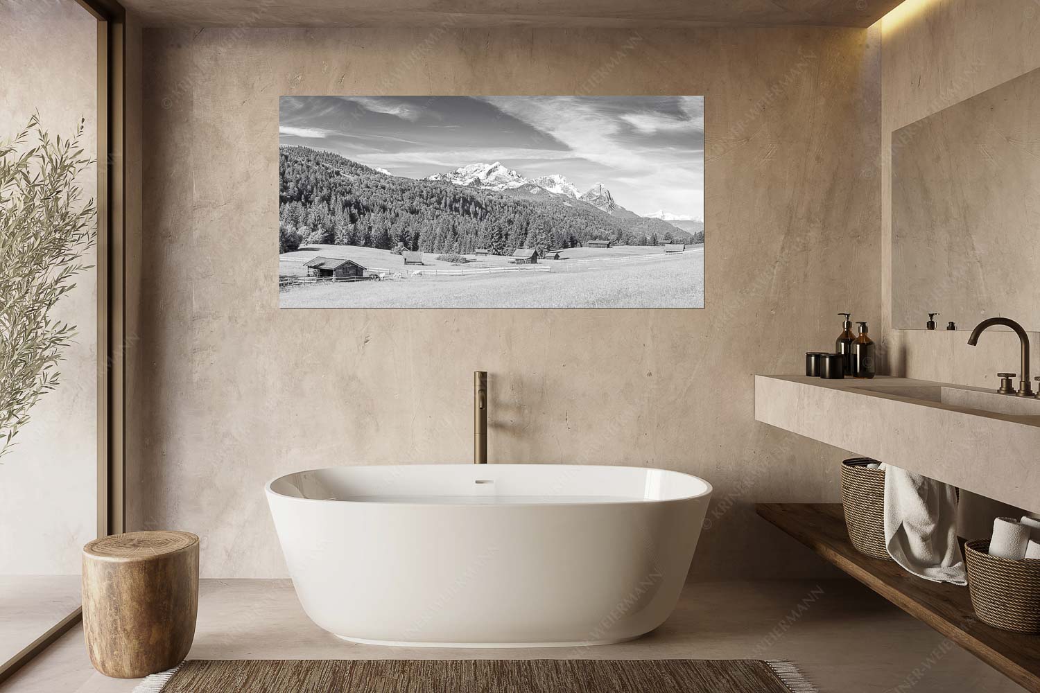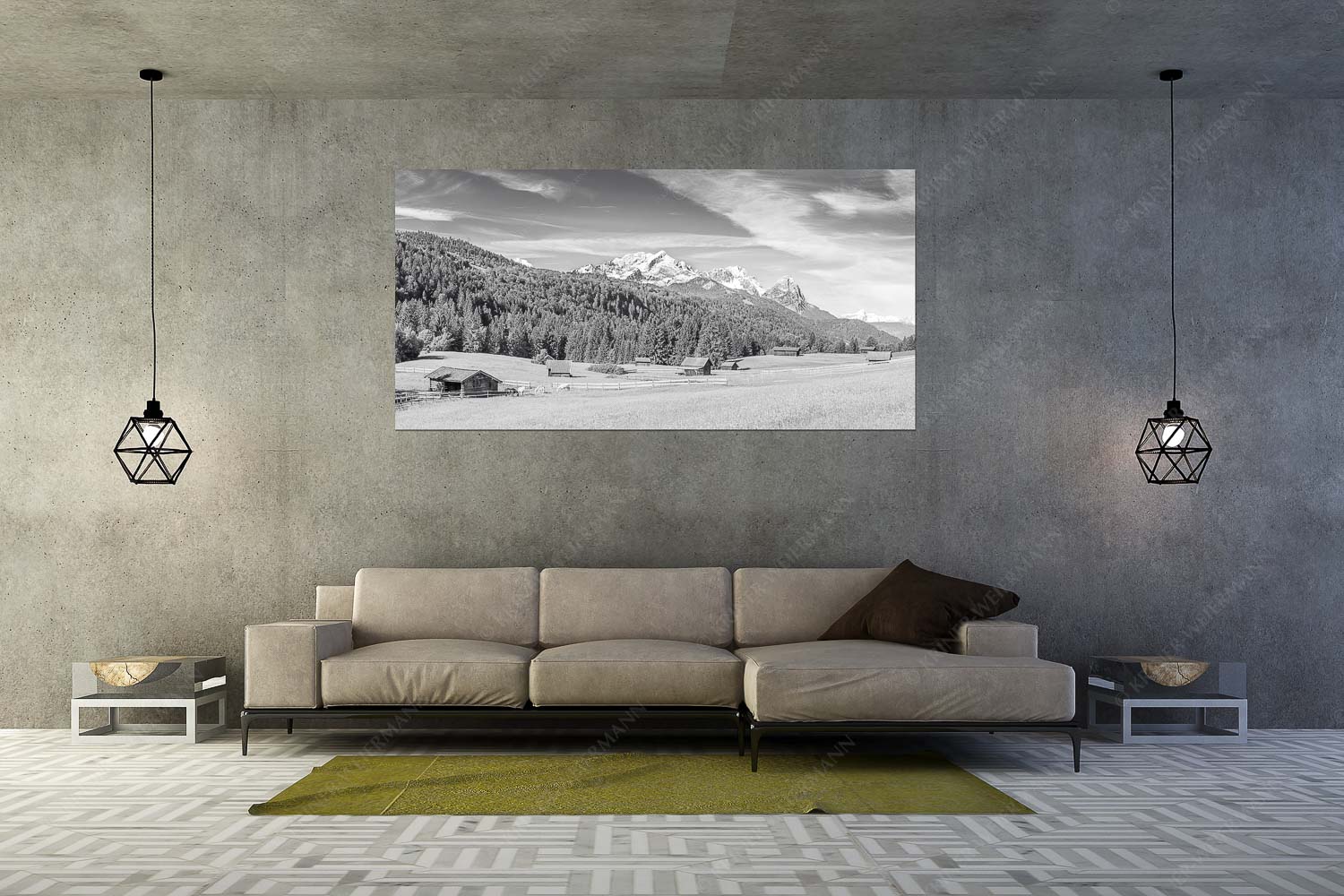 Idyllischer Zugspitzblick 2:1 sw — Heustadel Alpspitze Zugspitze Waxenstein