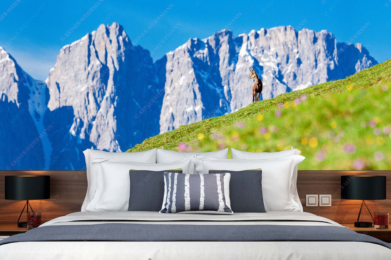 Gams auf Frühlingswiese mit Dreizinkenspitze im Karwendelgebirge