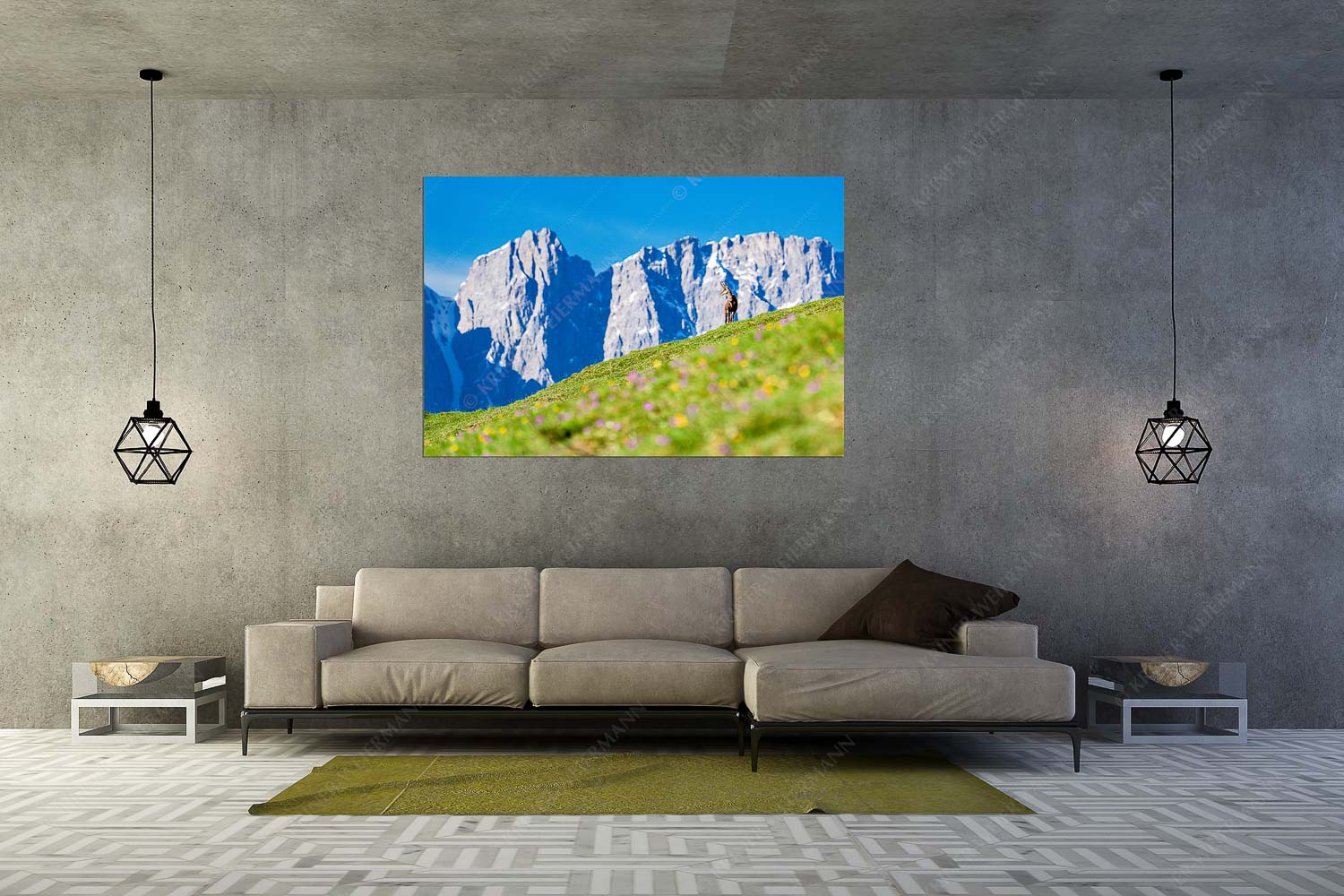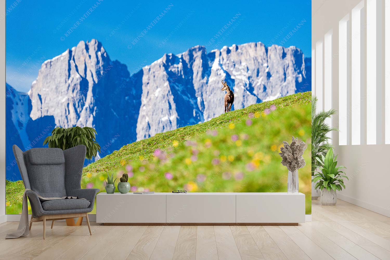 Gams auf Frühlingswiese mit Dreizinkenspitze im Karwendelgebirge