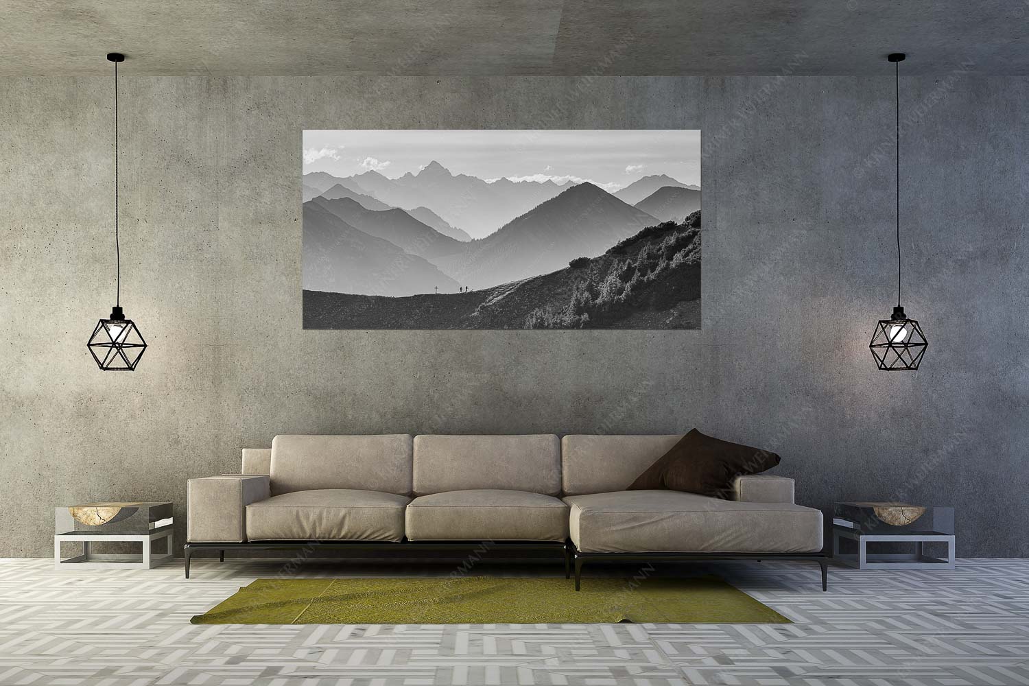 Im Spätherbst wenn die Sonne schon früh untergeht wird es einsam in den Bergen. Hier sind noch zwei Wanderer im Estergebirge unterwegs. Der Blick streift über den Bischofsattel und die Stepbergalm bis hinüber zum Hochvogel in den Allgäuer Alpen.