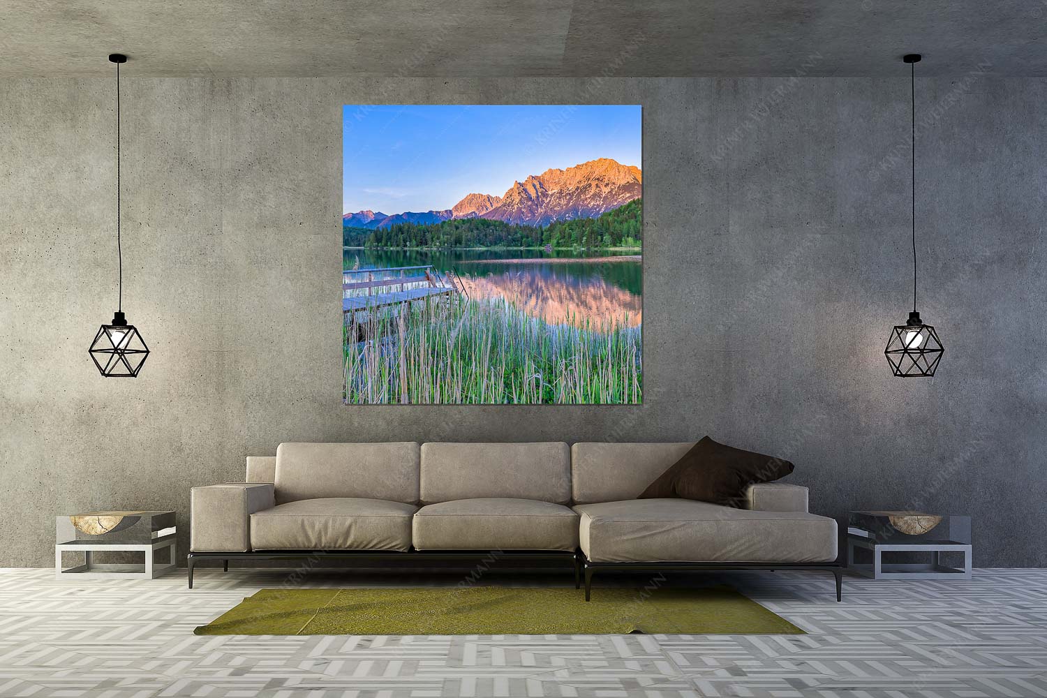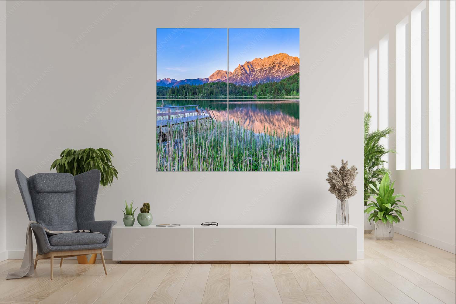 Am Ufer des Lautersees bei Mittenwald öffnet sich eine stille Abendstimmung, in der Wasser, Licht und Berge zu einem harmonischen Ganzen verschmelzen. Im Vordergrund rahmt hohes Schilf die Szene, ein schmaler Holzsteg führt von links in den See hinein und lädt gedanklich zum Baden ein. Die Oberfläche des Lautersees liegt ruhig und spiegelt das imposante Karwendelgebirge, das im letzten Licht des Tages in warmes Abendrot getaucht wird. Die Sonne ist bereits hinter dem Horizont verschwunden und beleuchtet nur noch die markanten Gipfel. Links schließt das Soierngebirge die Komposition, in der Mitte erheben sich Wörner, die charakteristische Viererspitze sowie die Westliche Karwendelspitze mit dem Gerberkreuz. Menschen sind keine zu sehen – die Landschaft gehört für einen Moment ganz sich selbst. Diese Aufnahme vereint die Beschaulichkeit des Sees mit der Kraft des Gebirges und fängt einen dieser Augenblicke ein, in denen der Tag leise, aber eindrucksvoll endet.