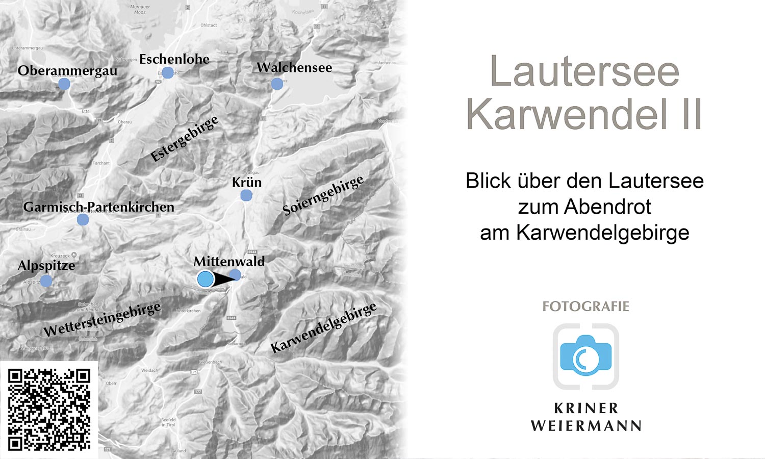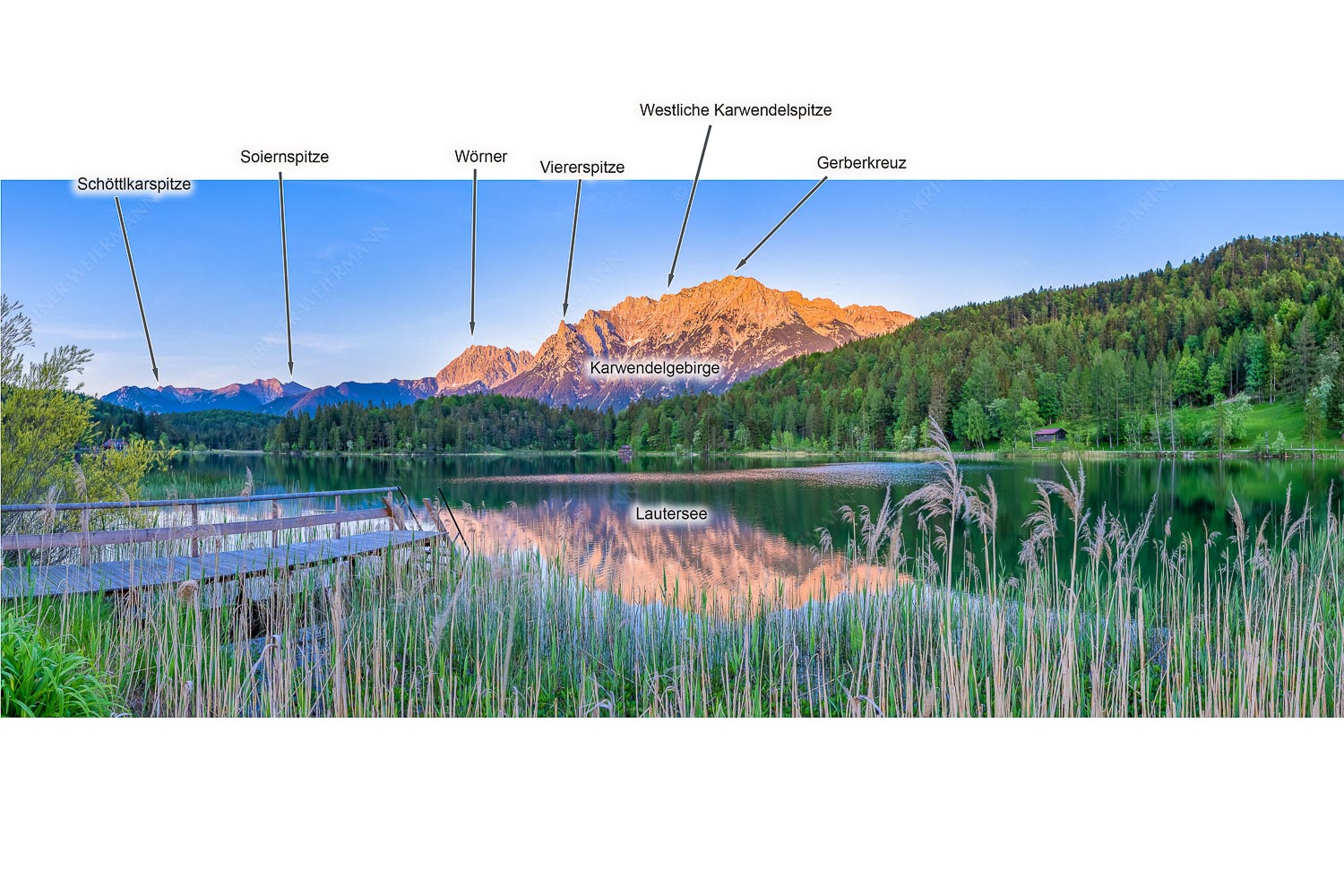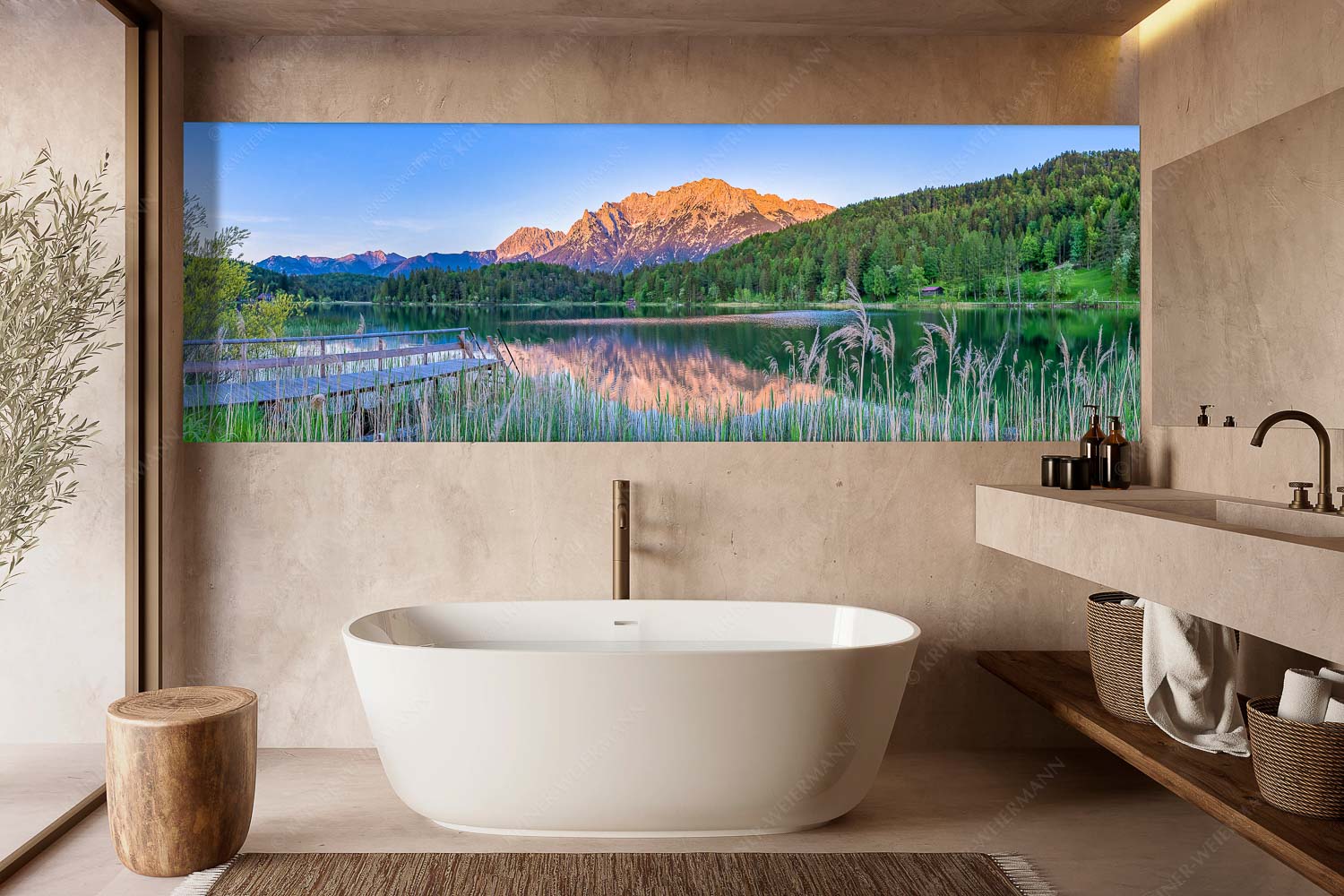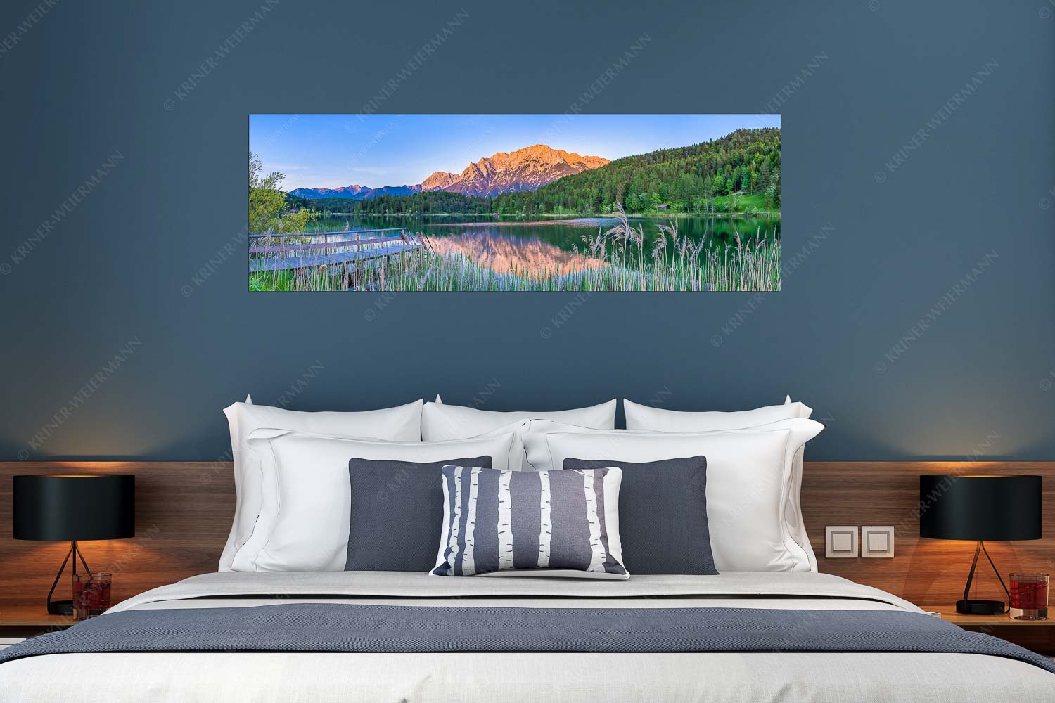 Am Ufer des Lautersees bei Mittenwald öffnet sich eine stille Abendstimmung, in der Wasser, Licht und Berge zu einem harmonischen Ganzen verschmelzen. Im Vordergrund rahmt hohes Schilf die Szene, ein schmaler Holzsteg führt von links in den See hinein und lädt gedanklich zum Baden ein. Die Oberfläche des Lautersees liegt ruhig und spiegelt das imposante Karwendelgebirge, das im letzten Licht des Tages in warmes Abendrot getaucht wird. Die Sonne ist bereits hinter dem Horizont verschwunden und beleuchtet nur noch die markanten Gipfel. Links schließt das Soierngebirge die Komposition, in der Mitte erheben sich Wörner, die charakteristische Viererspitze sowie die Westliche Karwendelspitze mit dem Gerberkreuz. Menschen sind keine zu sehen – die Landschaft gehört für einen Moment ganz sich selbst. Diese Aufnahme vereint die Beschaulichkeit des Sees mit der Kraft des Gebirges und fängt einen dieser Augenblicke ein, in denen der Tag leise, aber eindrucksvoll endet.