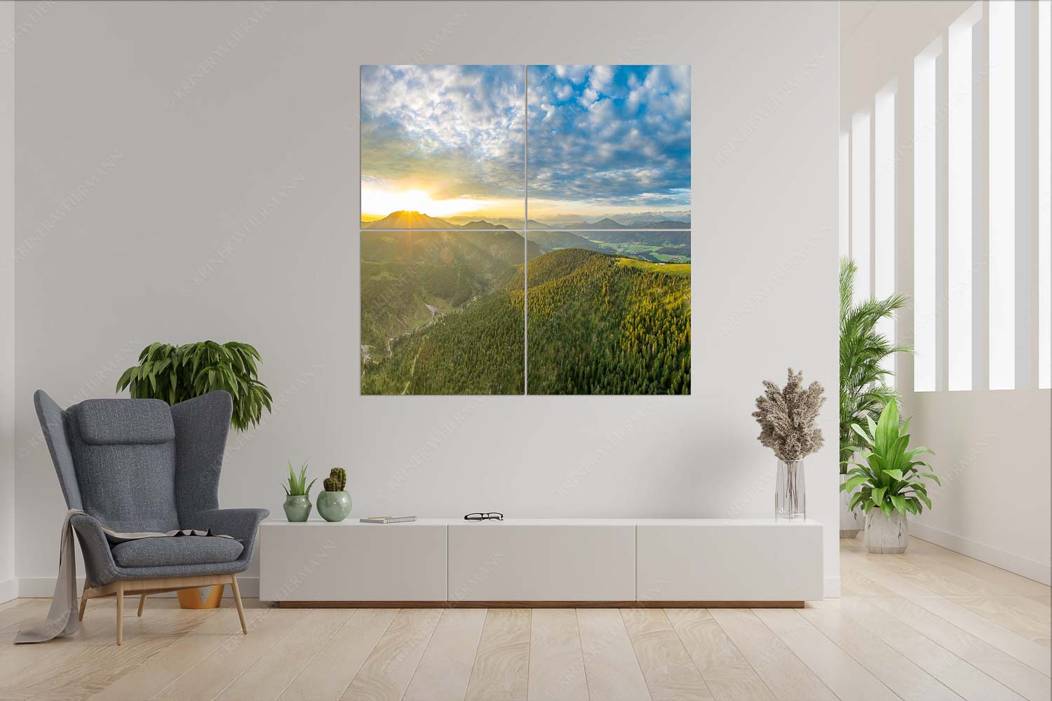 Mit dem ersten Licht des Tages öffnet sich ein weiter Blick über die Wälder oberhalb der Pfundalm. Es ist kurz nach sechs Uhr, als die Sonne links über der Benediktenwand aufgeht und die Wolken in sanften Tönen leuchten lässt. Die Pfundalm führt den Blick weiter hinaus in die Jachenau, wo sich die Landschaft ruhig und klar staffelt. In der Ferne glitzert der Walchensee, daneben zeichnet sich der Jochberg als markanter Münchner Hausberg ab. Noch weiter rechts unten lugt der Kochelsee hervor und ergänzt das Panorama um eine zweite Wasserfläche. Diese Aufnahme lebt von der Weite und der Ruhe des frühen Morgens: Wälder, Berge und Seen verbinden sich zu einem harmonischen Ganzen. Der Sonnenaufgang verleiht der Szene eine hoffnungsvolle Stimmung und macht den Moment des Tagesbeginns in den Bayerischen Alpen eindrucksvoll erlebbar.
