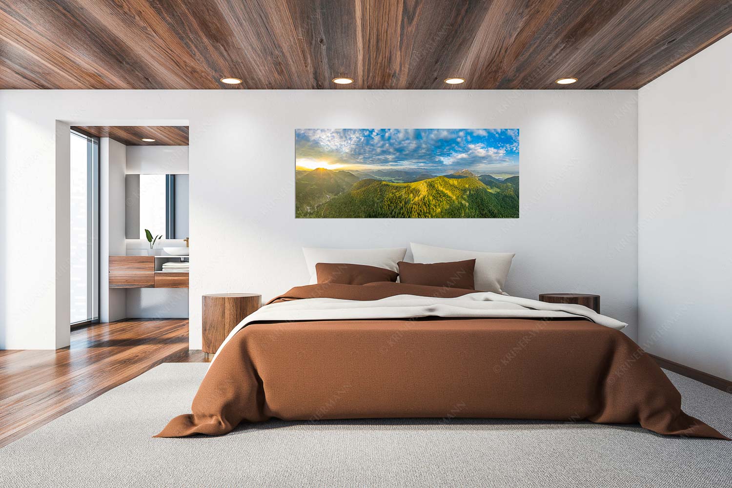 Mit dem ersten Licht des Tages öffnet sich ein weiter Blick über die Wälder oberhalb der Pfundalm. Es ist kurz nach sechs Uhr, als die Sonne links über der Benediktenwand aufgeht und die Wolken in sanften Tönen leuchten lässt. Die Pfundalm führt den Blick weiter hinaus in die Jachenau, wo sich die Landschaft ruhig und klar staffelt. In der Ferne glitzert der Walchensee, daneben zeichnet sich der Jochberg als markanter Münchner Hausberg ab. Noch weiter rechts unten lugt der Kochelsee hervor und ergänzt das Panorama um eine zweite Wasserfläche. Diese Aufnahme lebt von der Weite und der Ruhe des frühen Morgens: Wälder, Berge und Seen verbinden sich zu einem harmonischen Ganzen. Der Sonnenaufgang verleiht der Szene eine hoffnungsvolle Stimmung und macht den Moment des Tagesbeginns in den Bayerischen Alpen eindrucksvoll erlebbar.