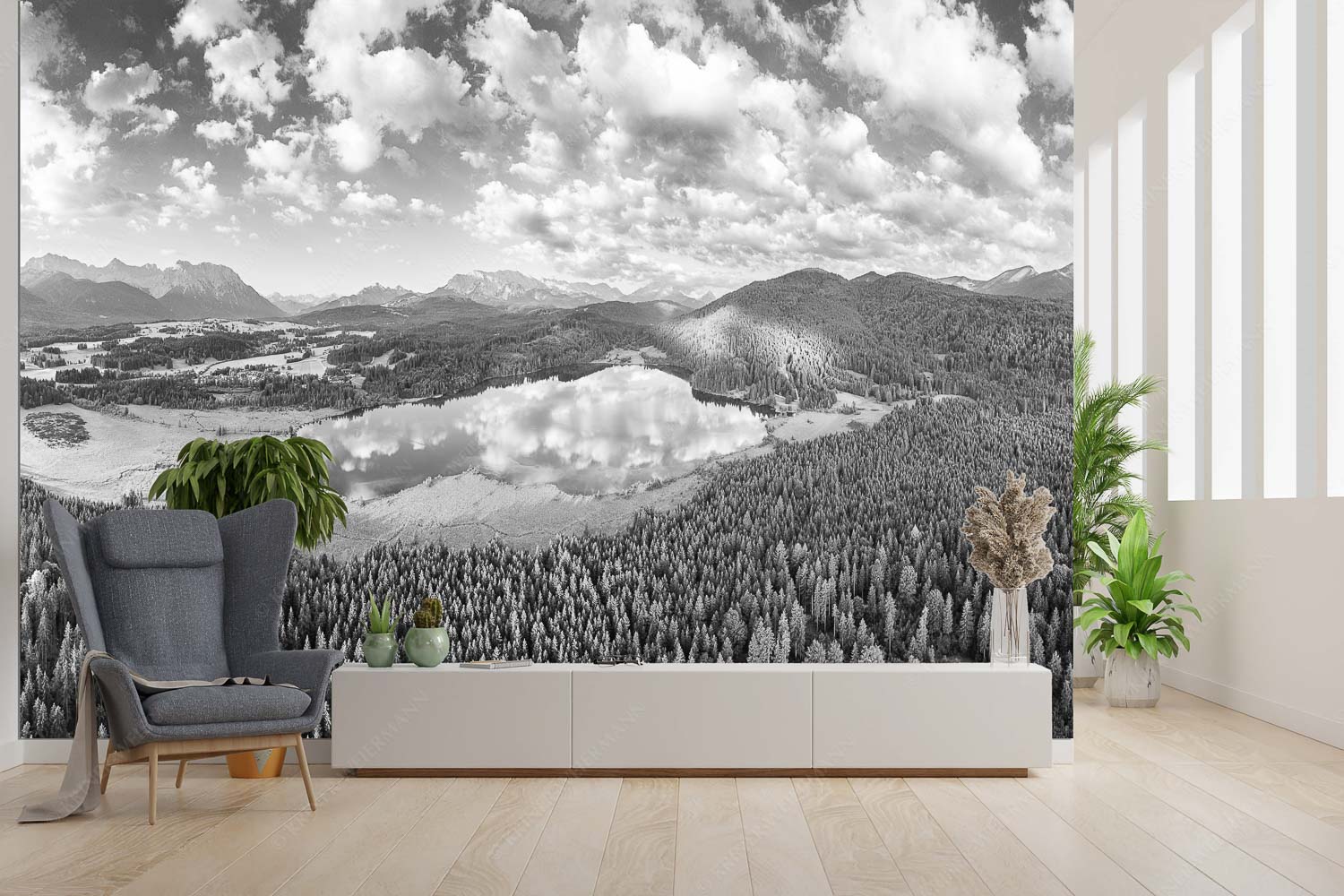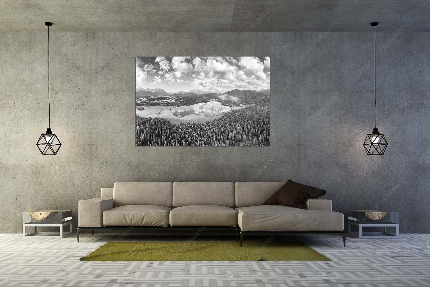 Lieblingssee II 3:2 sw — Luftaufnahme Barmsee mit Wetterstein