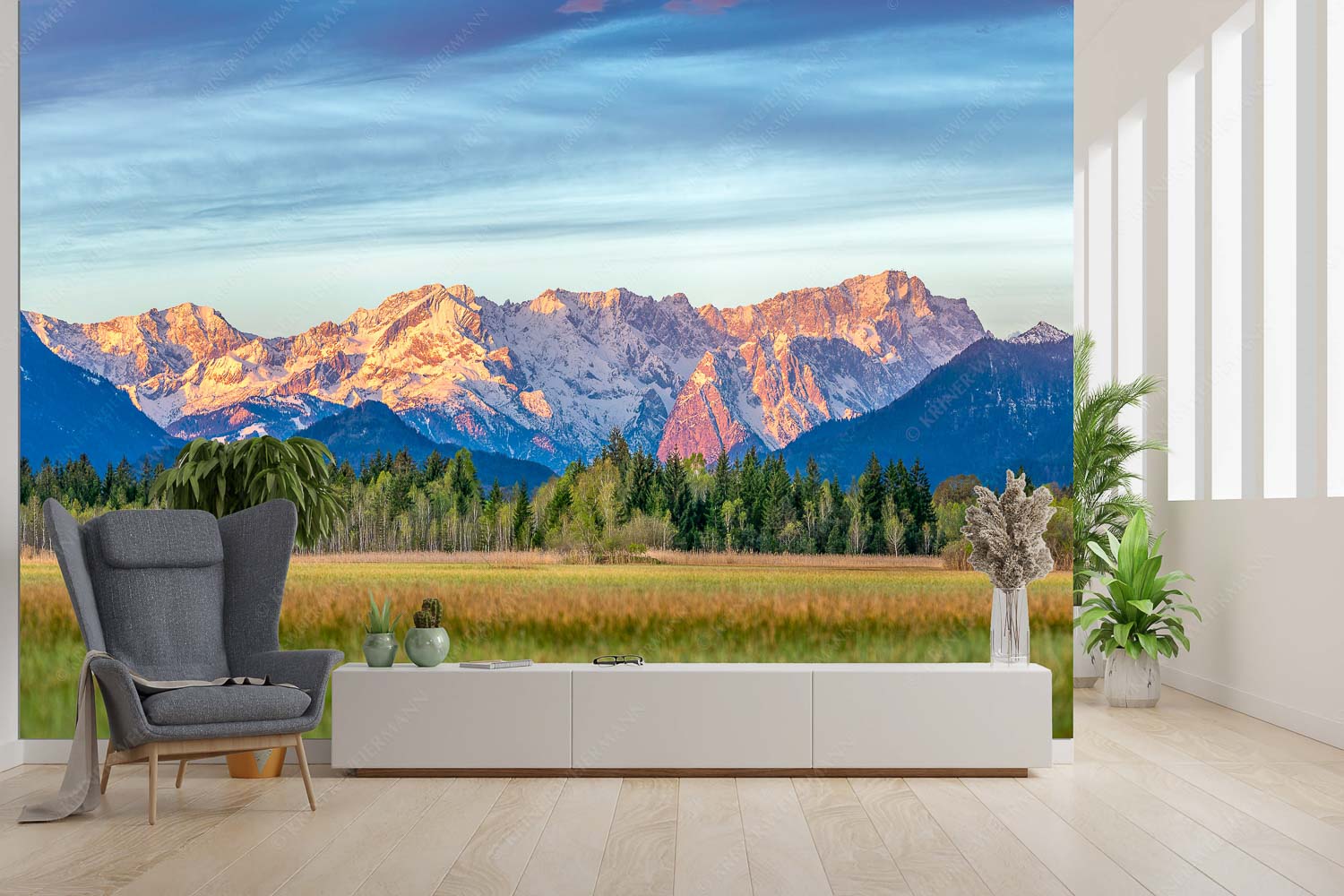 Blick von Murnau durchs Loisachtal zum Wettersteinmassiv mit Alpspitze und Zugspitze