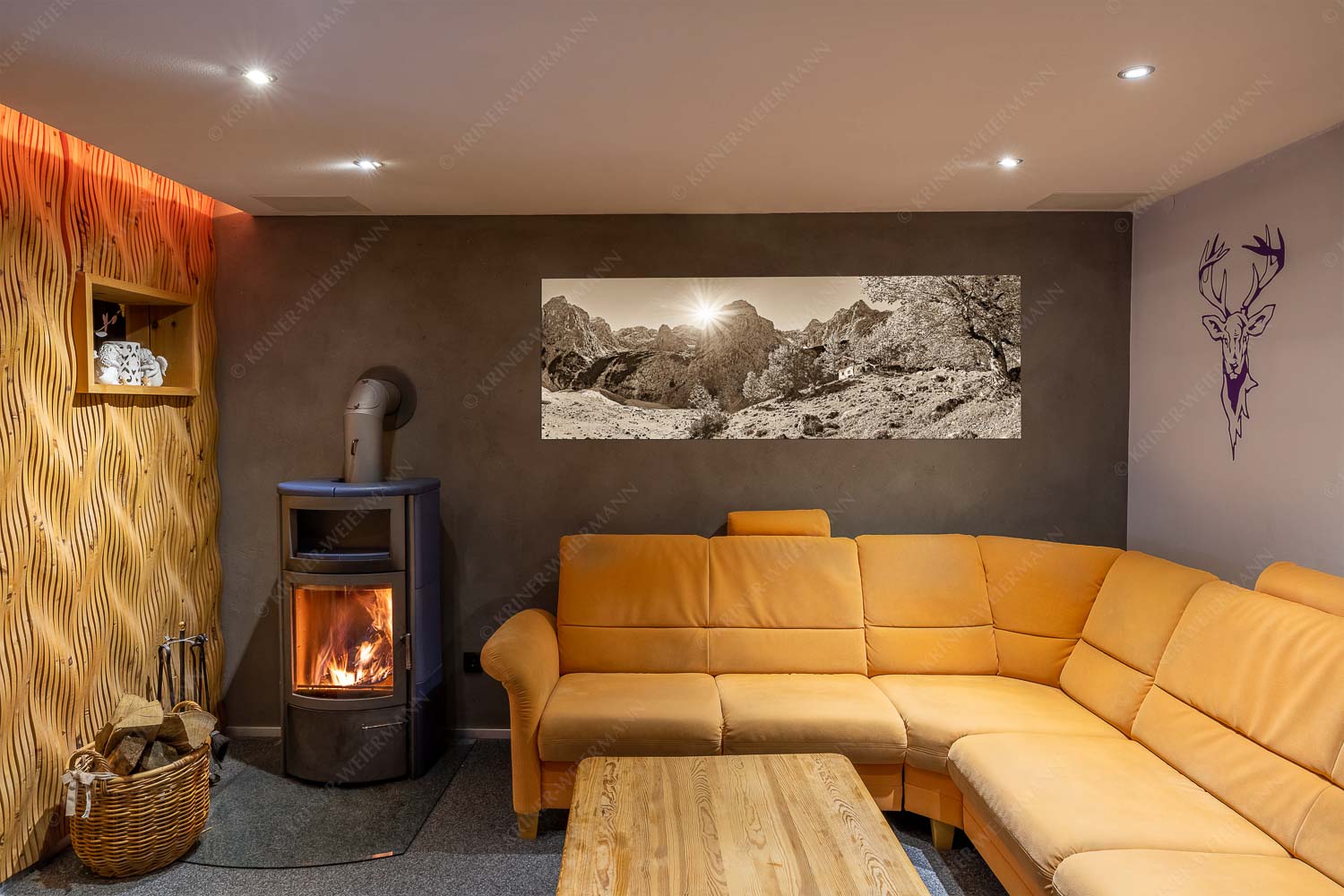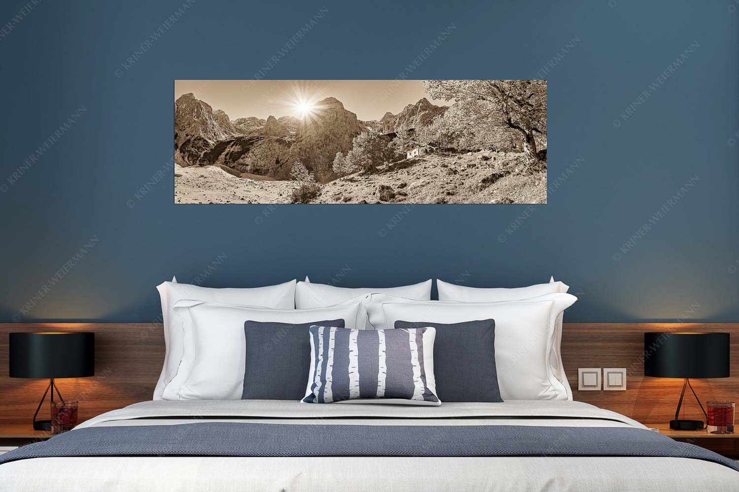 Das Bild „Oberreintal“ zeigt einen stimmungsvollen Herbstblick in eines der eindrucksvollsten Hochgebirgstäler des Wettersteingebirges. Die Kamera richtet sich talaufwärts in Richtung der bekannten Kletterberge, die das Oberreintal zu einem legendären Ziel für Alpinisten machen. Links ragt der Oberreintaldom empor, gefolgt von der schroffen Silhouette der Schüsselkarspitze und dem filigranen Schüsselkarturm. In der Mitte leuchtet das letzte Licht der tiefstehenden Herbstsonne am Oberreintalturm auf – ein Moment stiller Größe. Weiter rechts der Hundstallkopf und schließlich der Zundernkopf. Im rechten Bildteil liegt idyllisch die Oberreintalhütte, umrahmt von goldgelbem Bergahorn – ein warmer Farbtupfer im rauen Fels. Die Szenerie verkörpert die Magie eines Herbstabends im Gebirge, zwischen Licht, Stein und Stille. Ein Bild für Bergliebhaber, das die Kraft der Natur und die Schönheit des Vergänglichen feiert.