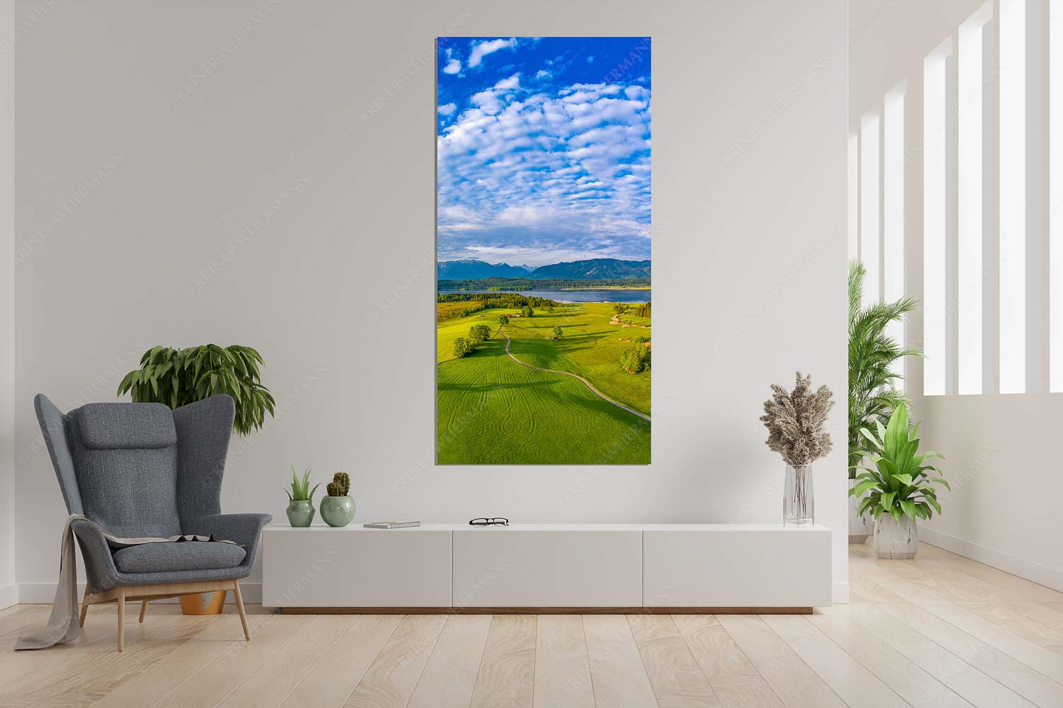 Ein zauberhafter Frühlingsmorgen entfaltet sich über den saftigen Wiesen von Uffing, die im ersten Licht des Tages erstrahlen. Der Staffelsee liegt ruhig im Hintergrund, umrahmt von den majestätischen Gipfeln des Estergebirges und Ammergebirges, mit dem markanten Hörnle rechts im Bild. In der Mitte zeigt sich das entfernte Wettersteingebirge, das durch die sanften, flockigen Wolken hindurchschimmert. Der lange Schatten der Bäume zeugt vom frühen Morgen, während ein einladender Weg von Uffing zum See führt. Diese Szenerie verkörpert die stille Schönheit und den friedlichen Beginn eines neuen Tages in der bayerischen Alpenlandschaft. Perfekt für Naturliebhaber und Wanderer bietet dieses Bild eine Einladung, die unberührte Natur und die frische Morgenluft zu genießen.
