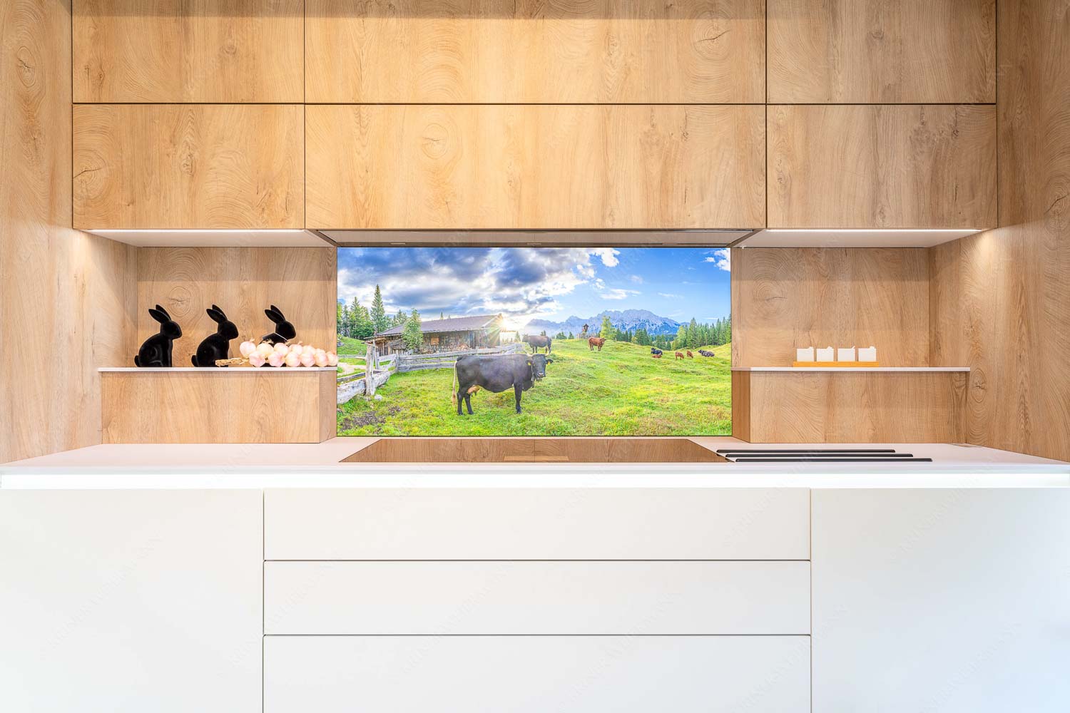 Dieses Bild fängt einen kostbaren Moment auf einer Alm oberhalb von Mittenwald ein – ein friedlicher Frühsommermorgen, der mit der aufgehenden Sonne langsam erwacht. Die urige Hütte mit ihren hölzernen Schindeln, der offenen Tür und der brennenden Laterne versprüht traditionellen Charme. Ein kleiner Sonnenstern schimmert am Dachfirst hervor und taucht die Szene in warmes Licht. Im Vordergrund stehen Rinder mit ihren Kälbern – alle mit Hörnern, was in der heutigen Zeit selten geworden ist. Sie grasen ruhig auf den saftig grünen Buckelwiesen, während hinter ihnen das Karwendelmassiv mit Wörner, Tiefkarspitze und Westlicher Karwendelspitze majestätisch aufragt. Sanfte Morgenwolken ziehen über den Himmel und unterstreichen die stille Kraft dieses Moments. Das Bild vereint bäuerliche Kultur, Naturidylle und die Nähe zu den Bergen – ein Abbild von Heimat und Ursprünglichkeit, das tief berührt.