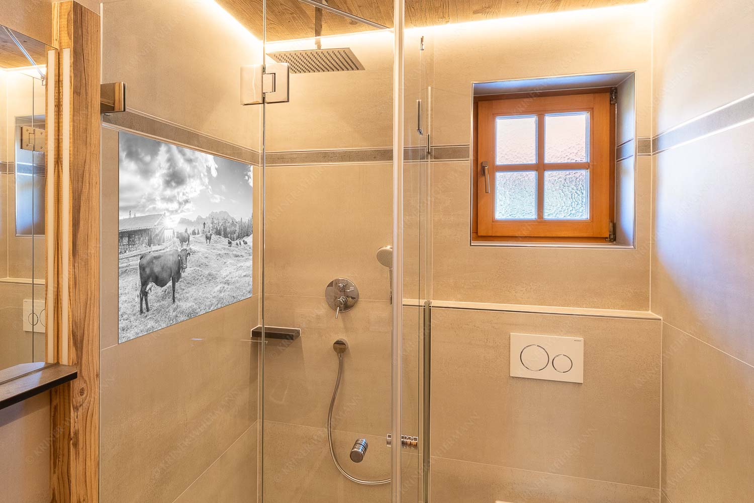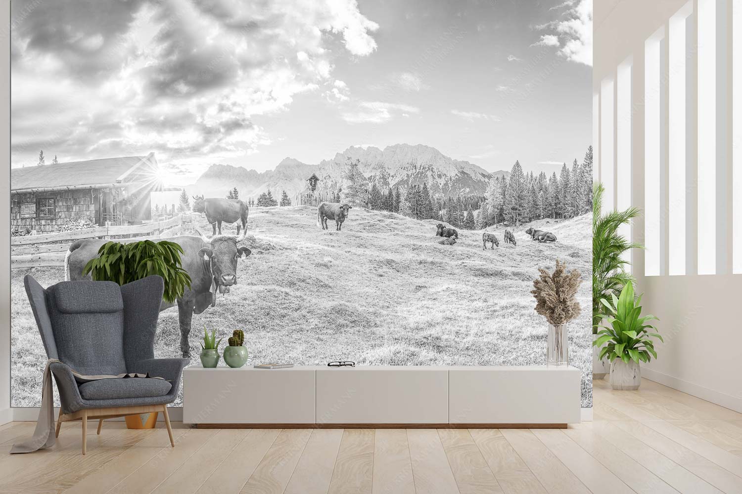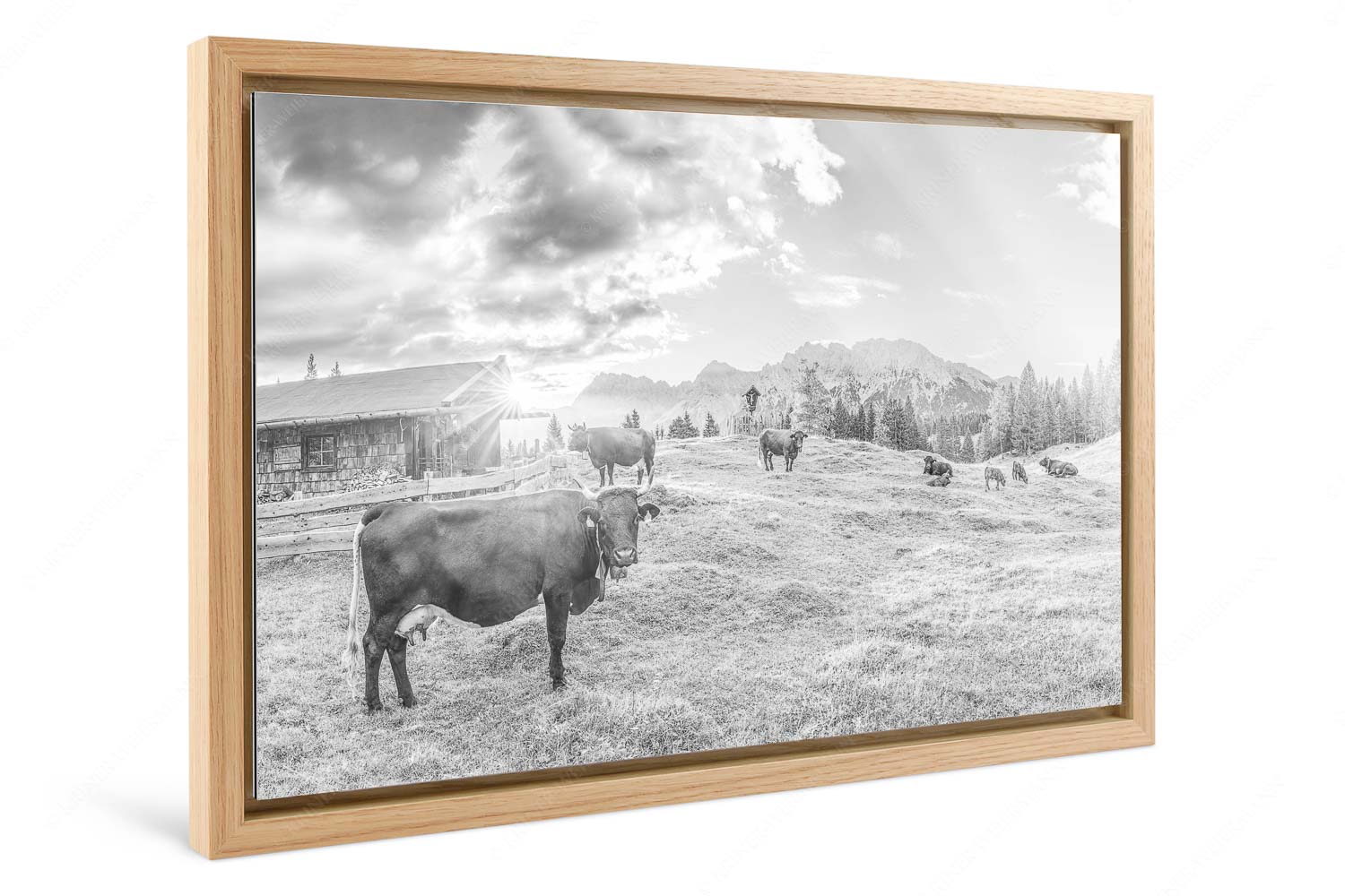 Dieses Bild fängt einen kostbaren Moment auf einer Alm oberhalb von Mittenwald ein – ein friedlicher Frühsommermorgen, der mit der aufgehenden Sonne langsam erwacht. Die urige Hütte mit ihren hölzernen Schindeln, der offenen Tür und der brennenden Laterne versprüht traditionellen Charme. Ein kleiner Sonnenstern schimmert am Dachfirst hervor und taucht die Szene in warmes Licht. Im Vordergrund stehen Rinder mit ihren Kälbern – alle mit Hörnern, was in der heutigen Zeit selten geworden ist. Sie grasen ruhig auf den saftig grünen Buckelwiesen, während hinter ihnen das Karwendelmassiv mit Wörner, Tiefkarspitze und Westlicher Karwendelspitze majestätisch aufragt. Sanfte Morgenwolken ziehen über den Himmel und unterstreichen die stille Kraft dieses Moments. Das Bild vereint bäuerliche Kultur, Naturidylle und die Nähe zu den Bergen – ein Abbild von Heimat und Ursprünglichkeit, das tief berührt.