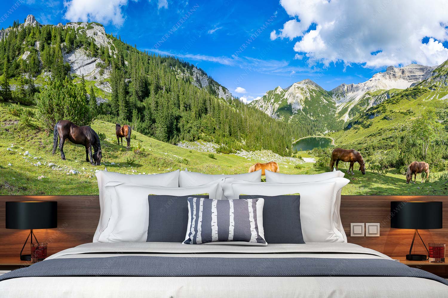 Pferde im Soierngebirge mit Soiernsee und Gumpenkarspitze