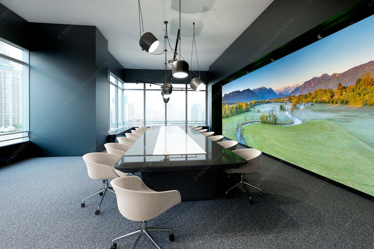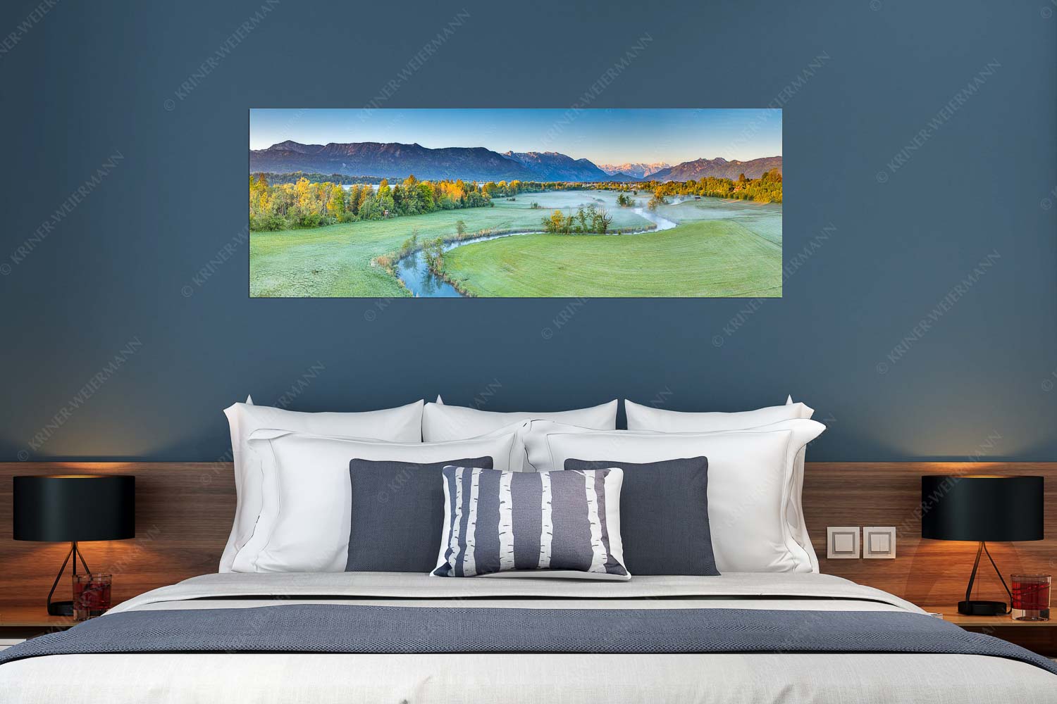 Das Bild „Ramsachschleife“ zeigt die stille Schönheit eines Frühlingsmorgens im bayerischen Alpenvorland. Der Blick fällt auf die Ramsach – ein größerer Bach, der sich in eleganten Kurven durch die Wiesen bei Murnau schlängelt. Noch liegt feiner Nebel über der Landschaft, doch erste Sonnenstrahlen brechen durch und streifen die Baumgipfel am Fluss. Es ist die magische Stunde des Sonnenaufgangs. Im Hintergrund öffnet sich der Blick auf drei Gebirgszüge: Links das Estergebirge mit der markanten Hohen Kisten, in der Mitte das Wettersteingebirge mit Alpspitze und Zugspitze – bereits in warmes Morgenlicht getaucht – und rechts das Ettaler Mandl in den Ammergauer Alpen. Diese Komposition verbindet Flusslandschaft, Wetterstimmung und imposante Bergkulisse in einer einzigartigen Harmonie. Ein Bild voller Ruhe, Licht und natürlicher Bewegung – ideal für Liebhaber stiller Momente und alpiner Übergänge.