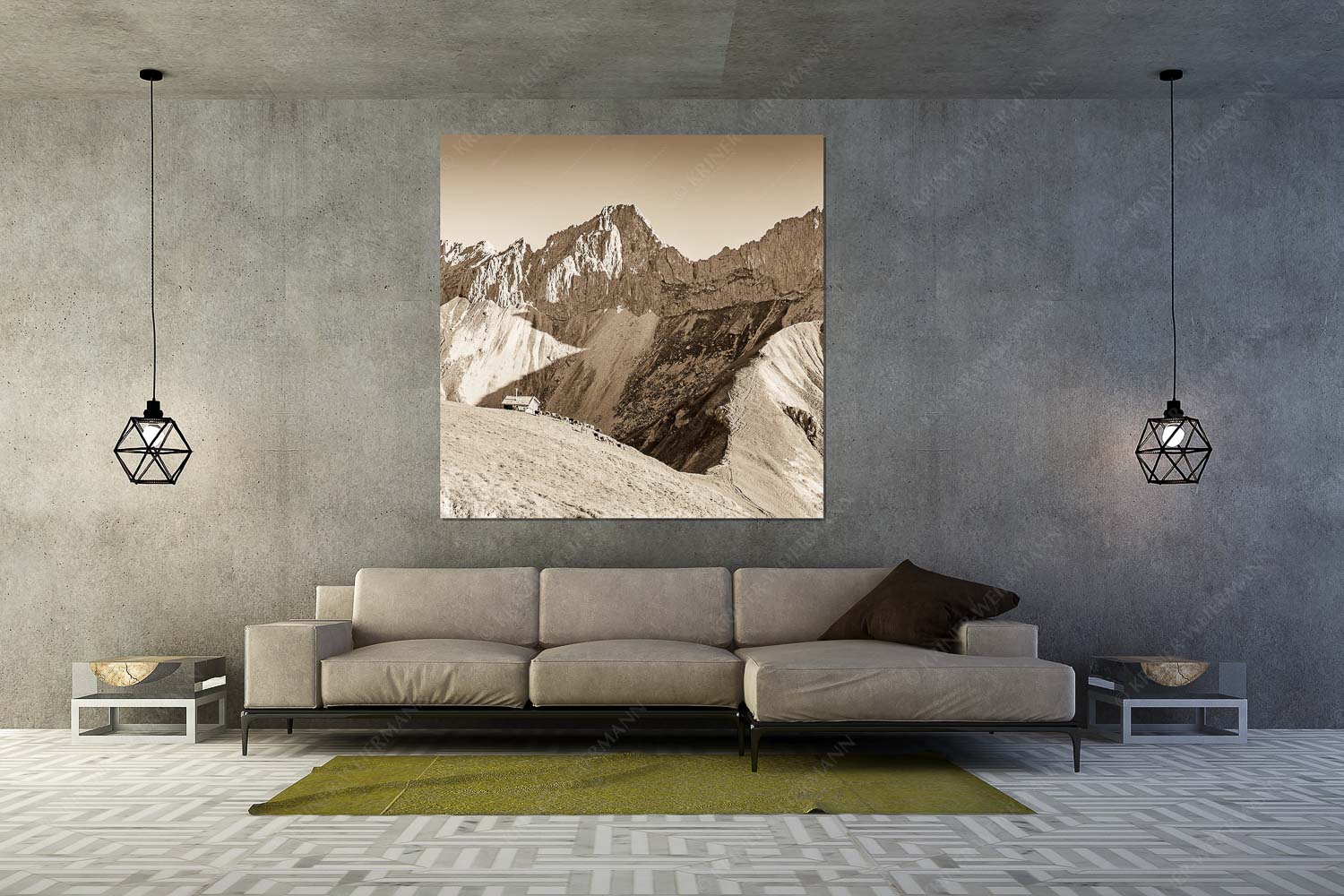 Scharnitzjoch 1:1 sepia — Schafe mit Erinnerungshütte im Wetterstein