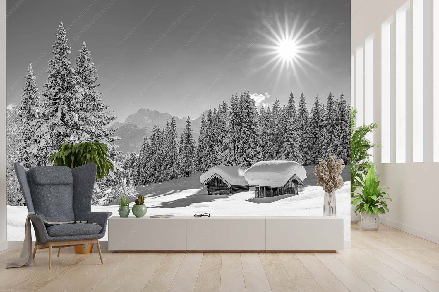 Eine tiefverschneite Winterlandschaft zwischen Krün und Mittenwald zeigt sich im Sonnenschein