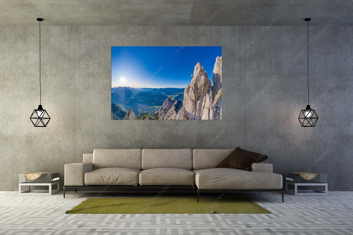 Das Bild „Steiler Zahn“ zeigt einen jungen Kletterer, wie er einen markanten, spitzen Felsturm im Karwendelgebirge erklimmt. Der Turm ragt steil aus dem Gelände hoch über Mittenwald empor und stellt mit seinem ausgesetzten Charakter und dem Schwierigkeitsgrad UIAA 6 eine alpine Herausforderung dar. Unter dem Kletterer liegt die Viererspitze, hinter ihm breitet sich das Obere Isartal mit dem Ort Mittenwald aus. Die untergehende Sonne taucht das Wettersteinmassiv mit Zugspitze und Arnspitzen in warmes Licht. Auch das Estergebirge zeigt sich im goldenen Abendlicht. Diese Szenerie verbindet alpinen Nervenkitzel mit der Erhabenheit einer beeindruckenden Berglandschaft. Das Foto steht symbolisch für Mut, Freiheit und die große Schönheit des Alpinismus in den Bayerischen Alpen.