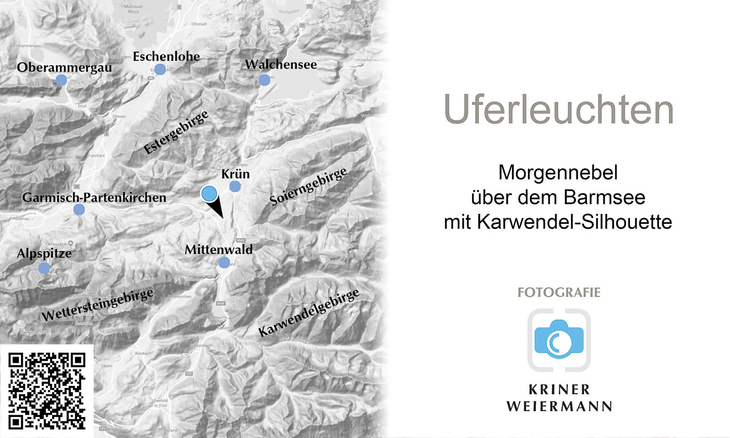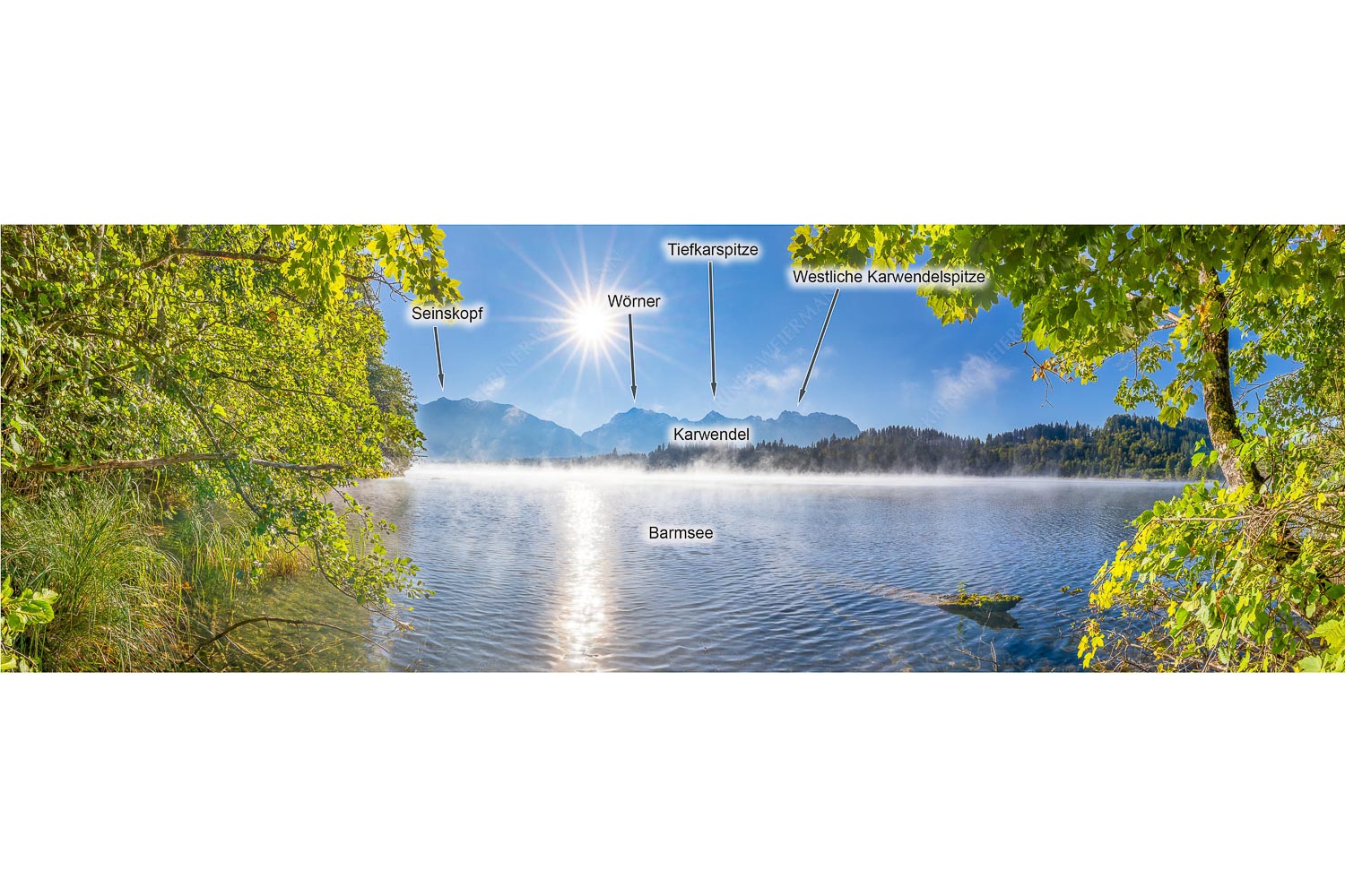 Früh am Morgen öffnet der Barmsee sein stilles Theater aus Licht, Nebel und Spiegelungen. Die Uferbäume rahmen den Blick mit ersten gelben Ahornblättern, Vorboten des Herbstes, während feine Kräusel auf dem Wasser das Sonnenlicht brechen. Hinter dem See zeichnet das Karwendel seine vertrauten Konturen in den Himmel: Wörner, Tiefkarspitze und die Westliche Karwendelspitze treten als klare Silhouetten hervor, vom bereits höheren Sonnenstand sanft überleuchtet. Der Nebel verflüchtigt sich in dünnen Fahnen und lässt den Blick weiter werden – ein Augenblick, in dem Ruhe und Weite zusammenfinden. Die Farbskala reicht von kühlen Wasser- und Blautönen bis zu warmen Goldnuancen im Laub und am Horizont. Diese Aufnahme erzählt vom Übergang: zwischen Nacht und Tag, Spätsommer und Herbst, Stille und beginnender Bewegung. Ein zeitloser, natürlicher Kontrast, der die Landschaft des Oberen Isartals in ihrer schlichten, klaren Schönheit zeigt.