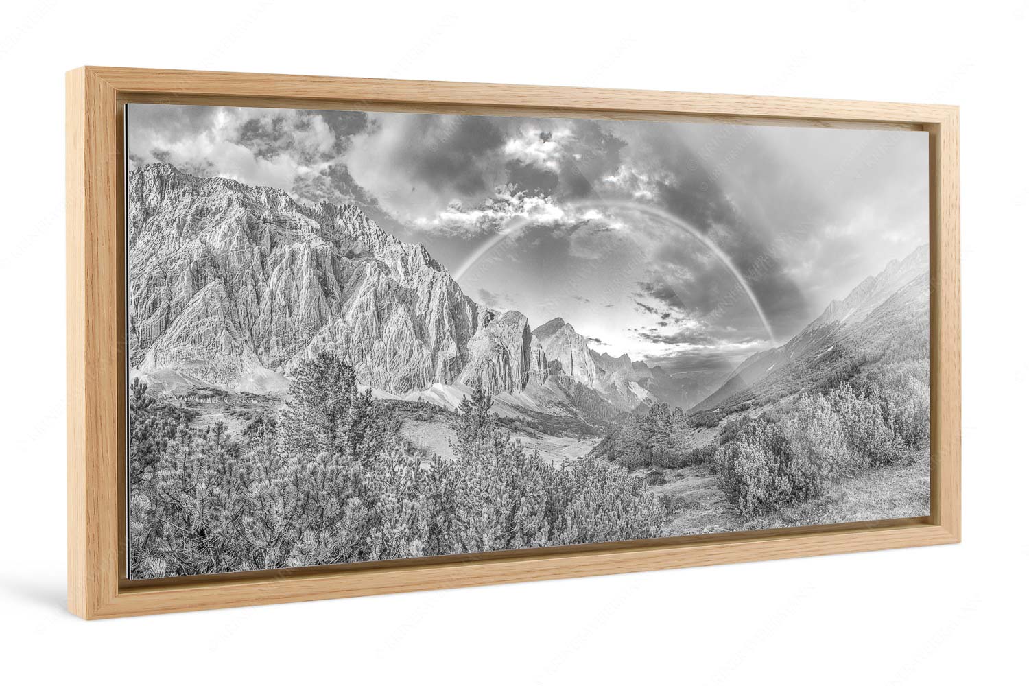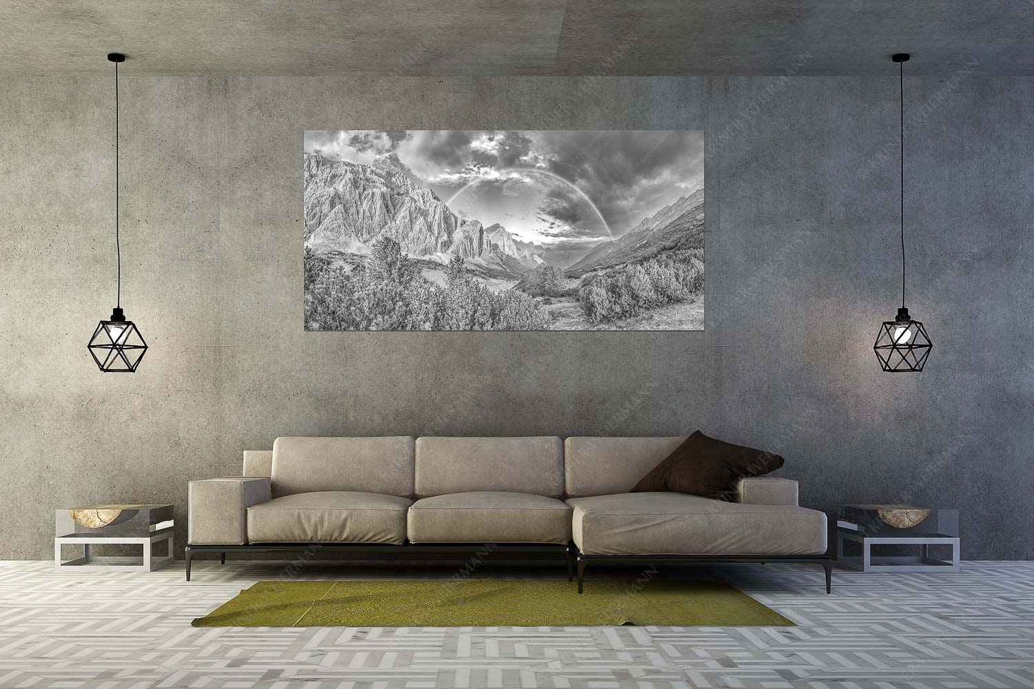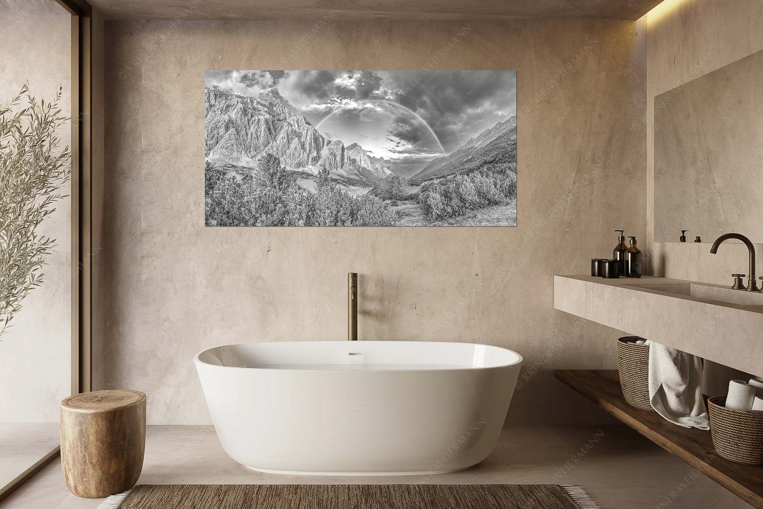 Ein zauberhafter Moment im Karwendel: Nach einem Regenschauer über dem Halleranger lichtet sich der Himmel, und die aufgehende Sonne taucht die Landschaft in warmes Licht. Gleichzeitig entsteht ein klarer Regenbogen, der sich über das Tal spannt – scheinbar schützend über die Berge gelegt. Im Vordergrund liegen dichte Latschenfelder, darüber ragen links die markante Speckkarspitze und mittig der Kleine Lafatscher auf. Weiter hinten zeigen sich die Östliche Praxmarerkarspitze und der Hohe Gleirsch. Noch hängen dunkle Wolken im Westen, doch im Osten bricht bereits das Licht durch – ein Spiel von Wetter, Farben und Formen. Diese Aufnahme vereint Naturgewalt und Sanftheit, Weite und Detail. „Verzaubert“ ist ein stimmungsvolles Bergbild für alle, die besondere Momente in den Alpen lieben – voller Ruhe, Magie und Präsenz. Ideal für Wohnräume mit Aussicht auf das Wesentliche.