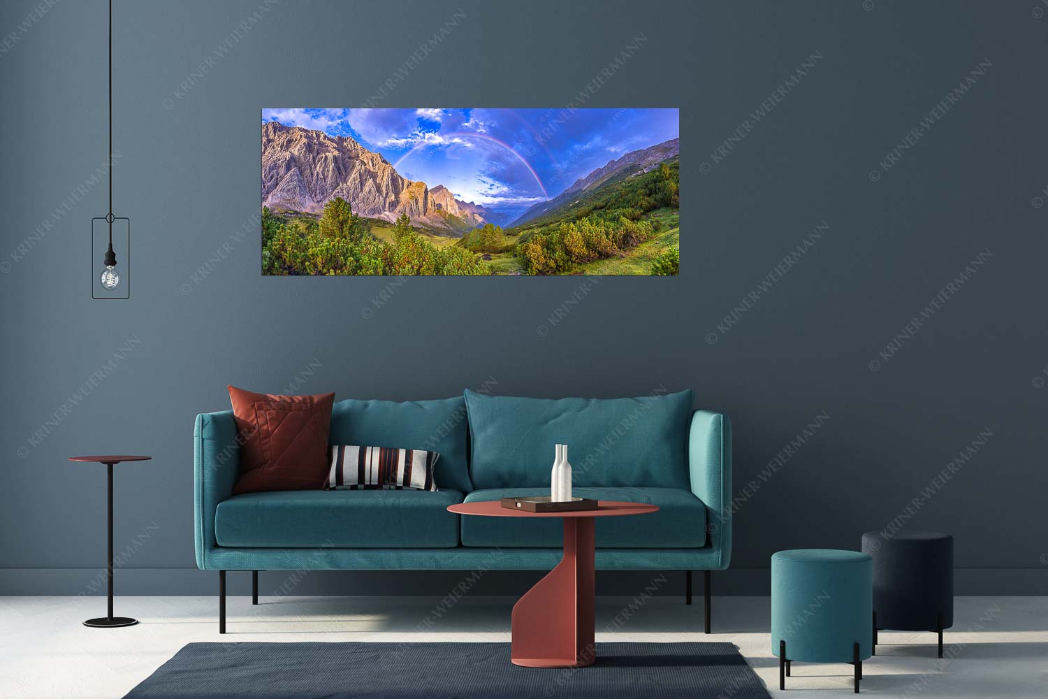 Ein zauberhafter Moment im Karwendel: Nach einem Regenschauer über dem Halleranger lichtet sich der Himmel, und die aufgehende Sonne taucht die Landschaft in warmes Licht. Gleichzeitig entsteht ein klarer Regenbogen, der sich über das Tal spannt – scheinbar schützend über die Berge gelegt. Im Vordergrund liegen dichte Latschenfelder, darüber ragen links die markante Speckkarspitze und mittig der Kleine Lafatscher auf. Weiter hinten zeigen sich die Östliche Praxmarerkarspitze und der Hohe Gleirsch. Noch hängen dunkle Wolken im Westen, doch im Osten bricht bereits das Licht durch – ein Spiel von Wetter, Farben und Formen. Diese Aufnahme vereint Naturgewalt und Sanftheit, Weite und Detail. „Verzaubert“ ist ein stimmungsvolles Bergbild für alle, die besondere Momente in den Alpen lieben – voller Ruhe, Magie und Präsenz. Ideal für Wohnräume mit Aussicht auf das Wesentliche.