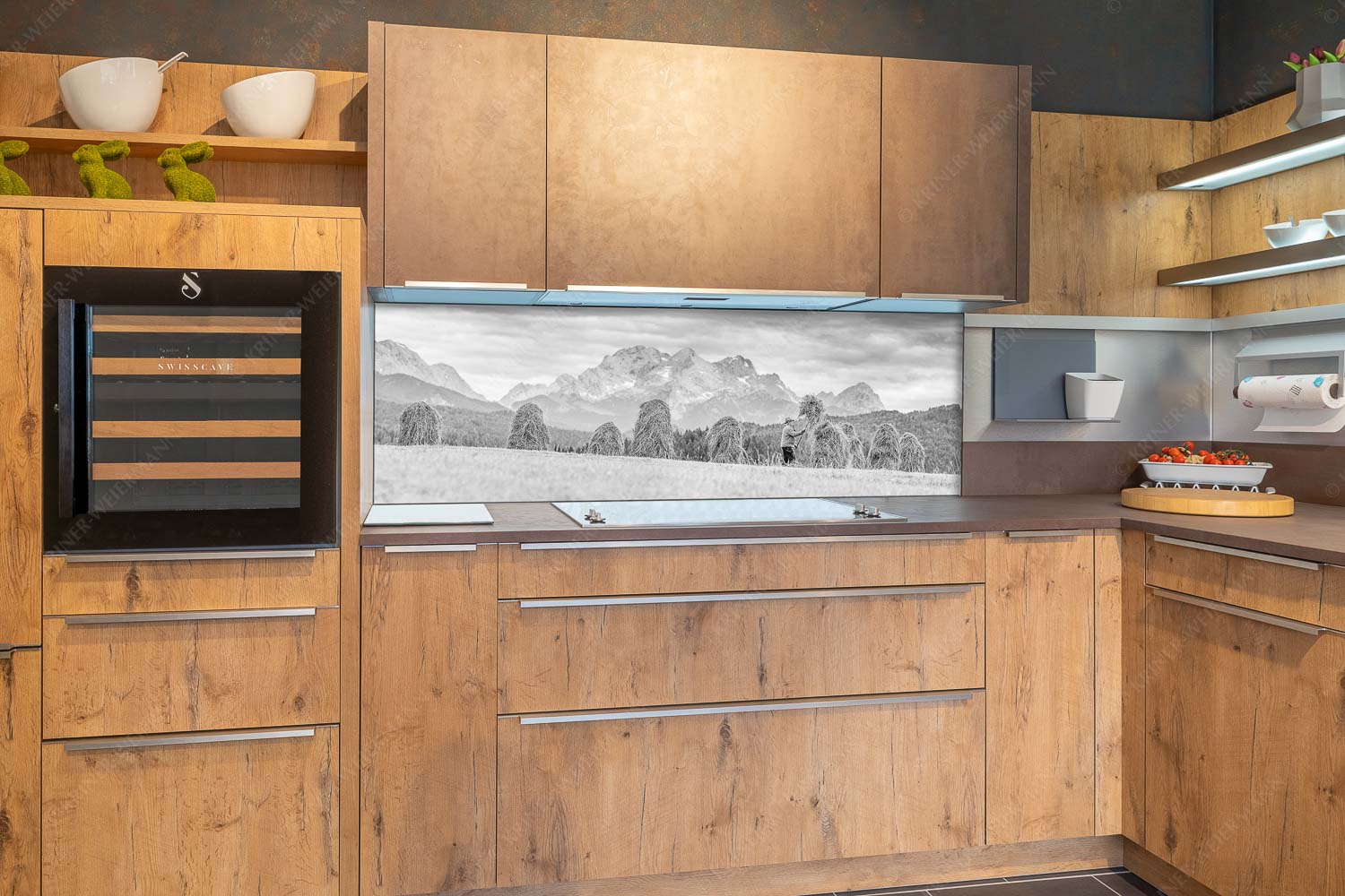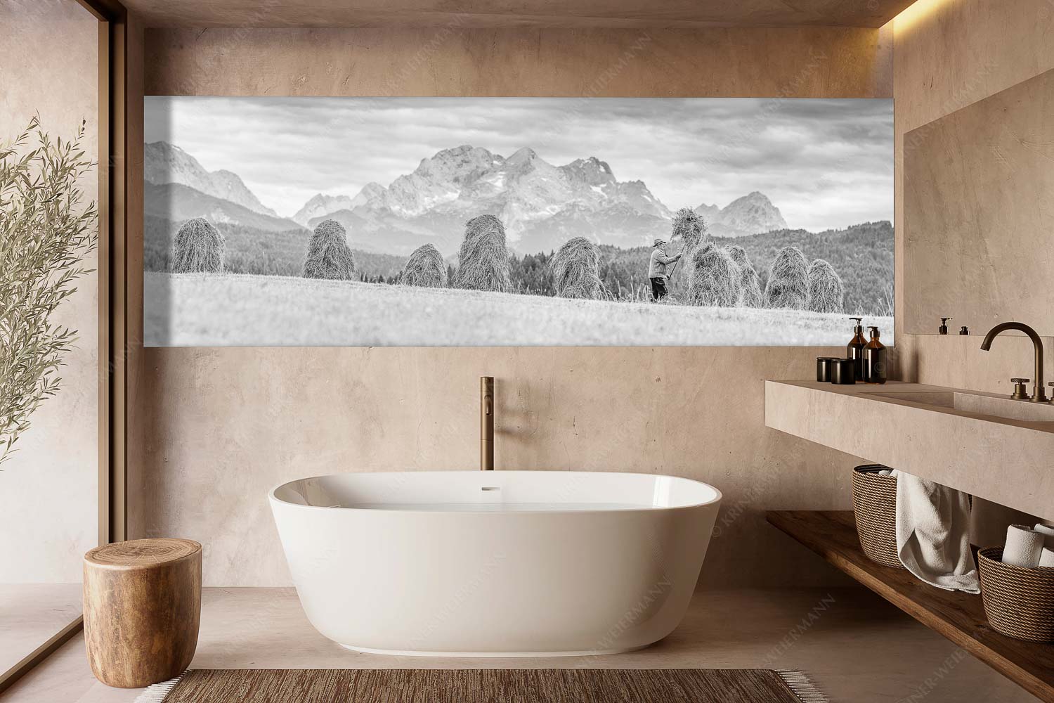 Das Bild „Wia friahra“ zeigt einen Moment, wie er aus einer anderen Zeit stammen könnte – und doch heute noch gelebte Realität auf manchen Wiesen in den bayerischen Alpen ist. Ein älterer Mann, traditionell gekleidet mit Schafwolljanker, Hut und Pfeife im Mund, belädt ruhig und routiniert einen Stanker mit frisch gemähtem Heu. Er hat bereits ein Dutzend bepackte Heustanker – ein Wettlauf gegen das Wetter, denn am Horizont kündigen sich dunkle Wolken an. Das Heu muss vor dem Regen geschützt werden. Im Hintergrund ragt das eindrucksvolle Zugspitzmassiv mit Alpspitze und Waxenstein auf – eine kraftvolle Kulisse, die die Szene zusätzlich mit Tiefe und Bedeutung auflädt. Dieses Bild steht für das „Wia friahra“: harte Arbeit mit den Händen, ein Leben im Rhythmus der Natur und die Fortführung alpiner Traditionen. Es ist eine stille Hommage an das ursprüngliche Leben in den Bergen.