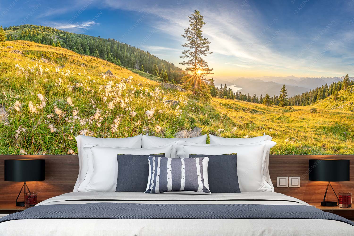 In den frühen Morgenstunden entfaltet sich im Estergebirge ein magisches Schauspiel der Natur. Die ersten Sonnenstrahlen brechen in einem leuchtenden Stern durch die Äste eines Baumes und tauchen die Bergwiese in ein goldenes Licht. Die zarten Wollgräser im Vordergrund wiegen sanft im Wind und verleihen der Szenerie eine besondere Leichtigkeit. Links im Hintergrund erhebt sich majestätisch der Simetsberg, während rechts der Walchensee hinter dem Wald hervorblitzt. Das Karwendelvorgebirge schließt sich harmonisch an, umrahmt von der sanften Morgenstimmung. Diese Aufnahme fängt die stille Erhabenheit der Alpenlandschaft ein und lädt den Betrachter ein, in die Ruhe und Schönheit der Natur einzutauchen. Ein perfekter Moment, der die Seele berührt und die Sinne erfrischt.