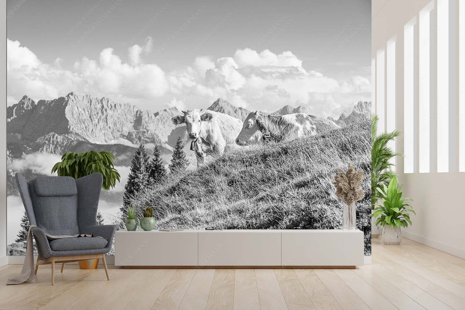„Wos is?“ zeigt eine typische Szene oberbayerischer Almidylle mit einem Augenzwinkern. Auf der Sommerweide der Wallgaueralm im oberen Isartal rasten zwei junge Rinderkälber. Eines davon schläft tiefenentspannt, das andere blickt direkt in die Kamera – mit einem neugierig-misstrauischen Blick, der wie ein stummes „Wos is?“ wirkt. Der Moment wirkt ruhig und humorvoll zugleich und erzählt vom engen Miteinander von Mensch, Tier und Bergnatur. Hinter den Kälbern erhebt sich eindrucksvoll das Karwendelgebirge mit dem markanten Wörner auf der linken Seite, der Tiefkarspitze in der Mitte und dem Karwendelkopf rechts. Die Sommerstimmung wird durch das weiß-blaue Himmelsbild mit freundlichen Quellwolken unterstrichen. Dieses Bild fängt die Herzlichkeit und Ursprünglichkeit des Almlebens auf authentische Weise ein – ein Motiv, das zum Schmunzeln und Innehalten einlädt.