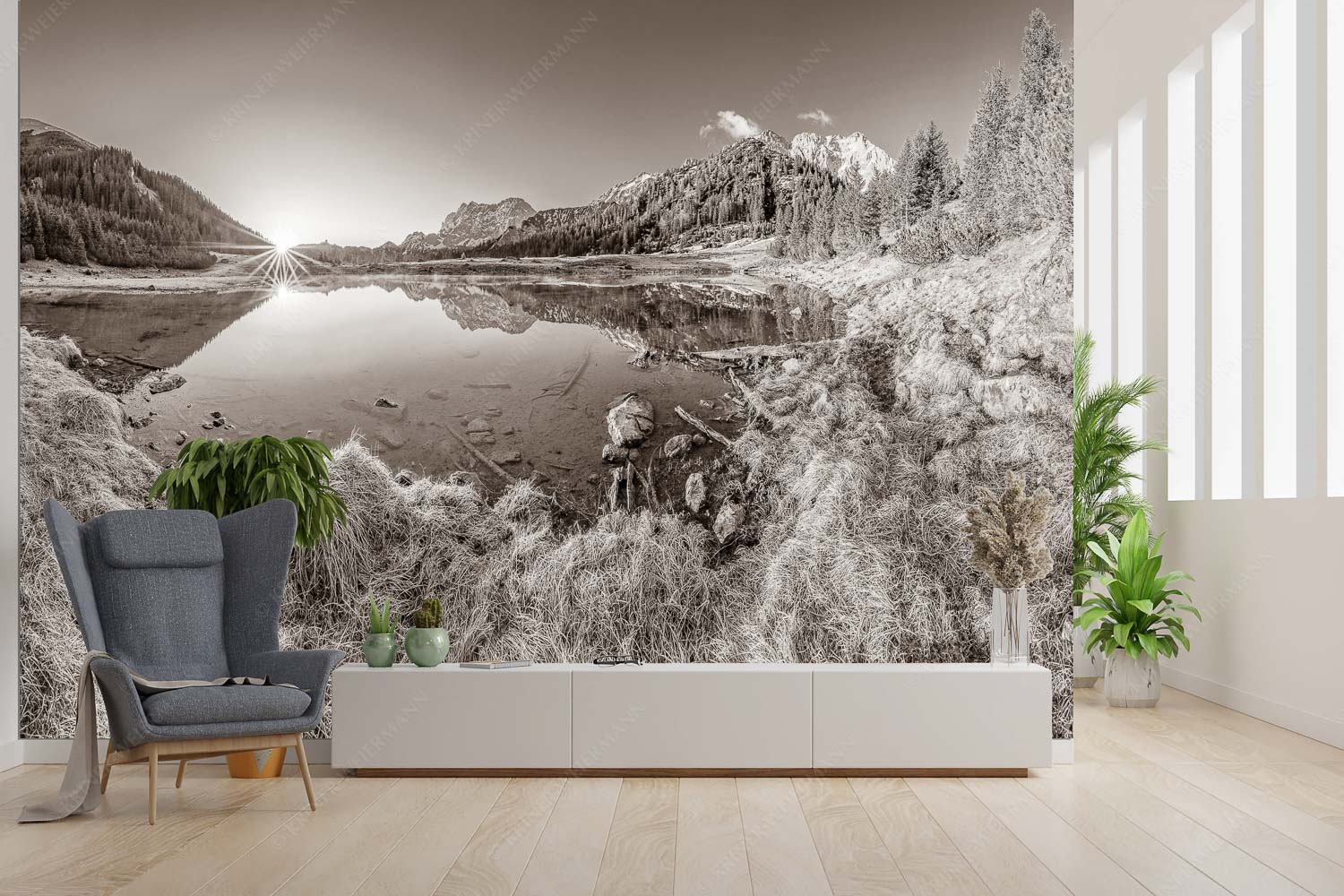In den ersten Sonnenstrahlen eines klaren, eiskalten Morgens erstrahlt der kleine See an der Fereineralm in einer faszinierenden Ruhe. Die Gräser sind mit zartem Raureif überzogen, der die Kälte der Nacht erahnen lässt. Links erhebt sich majestätisch die Soiernspitze, während die Rappenklammspitze in der Bildmitte klein erscheint. Die Östliche- und die Vogelkarspitze mit dem Bärnalplkopf schließen sich an und führen den Blick weiter nach rechts zur Hochkarspitze und dem Wörner. Der See liegt still und klar, sein Wasser spiegelt die umliegende Bergwelt wider und verstärkt die erhabene Stille dieses Moments. Diese Szene lädt zum Innehalten ein, zum Atmen und Genießen der unberührten Natur, die sich in ihrer ganzen Pracht zeigt.