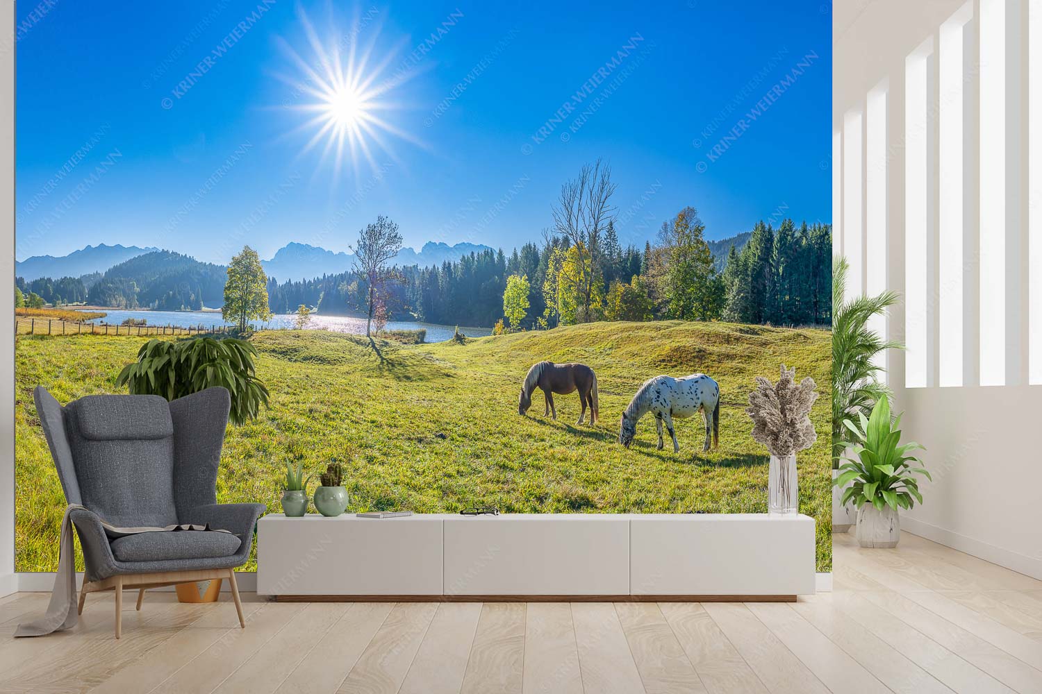 Zwei Pferde auf Herbstweide vor dem Geroldsee mit Blick zum Wörner im Karwendel